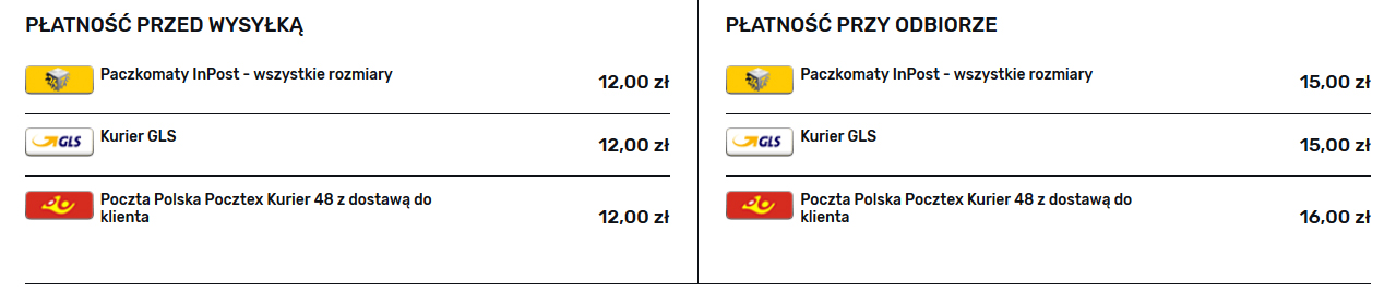 Przesyłki na terenie Polski realizujemy za pomocą firmy kurierskiej GLS, Paczkomatów InPost oraz Poczty Polskiej. Koszt dostawy uzależniony jest od wybranej formy płatności: