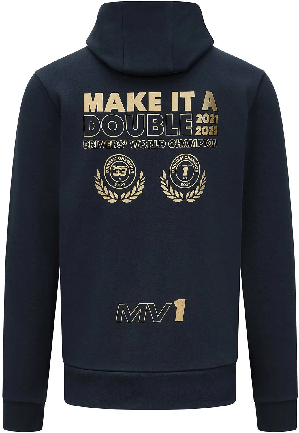 Shop the special commemorative Hoodie. Celebrating Max Verstappen securing his second 2022 FIA Formula One Drivers' Championship, the hoodie features a metallic gold 'Make it a double' print graphic on the rear.