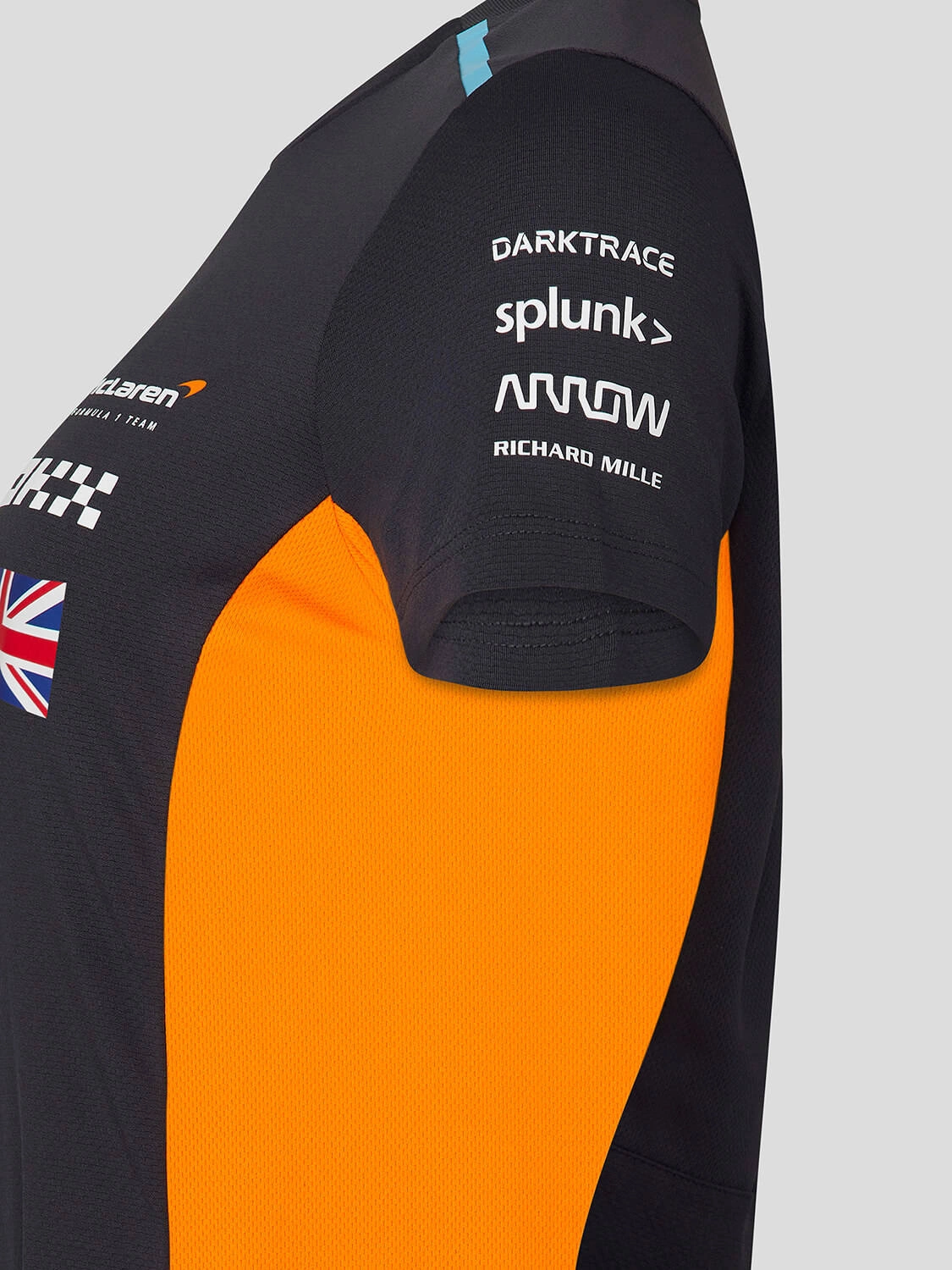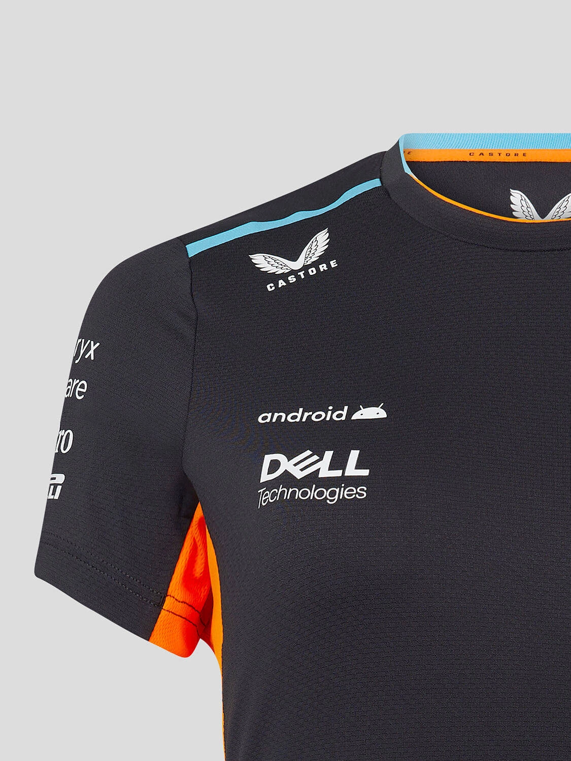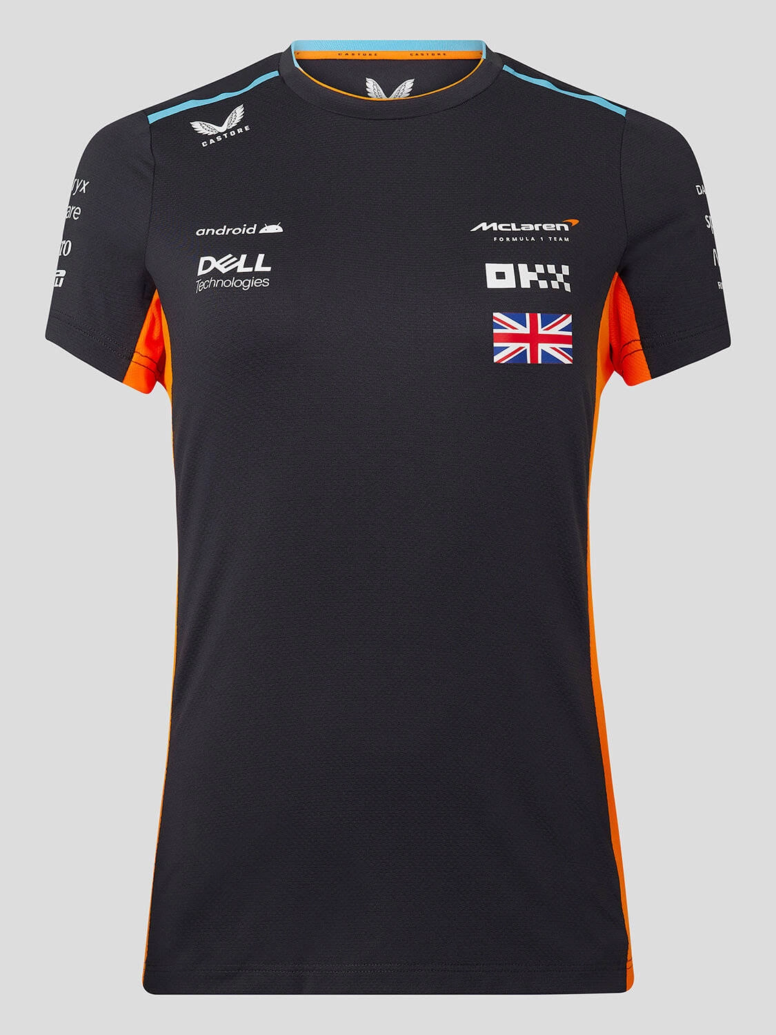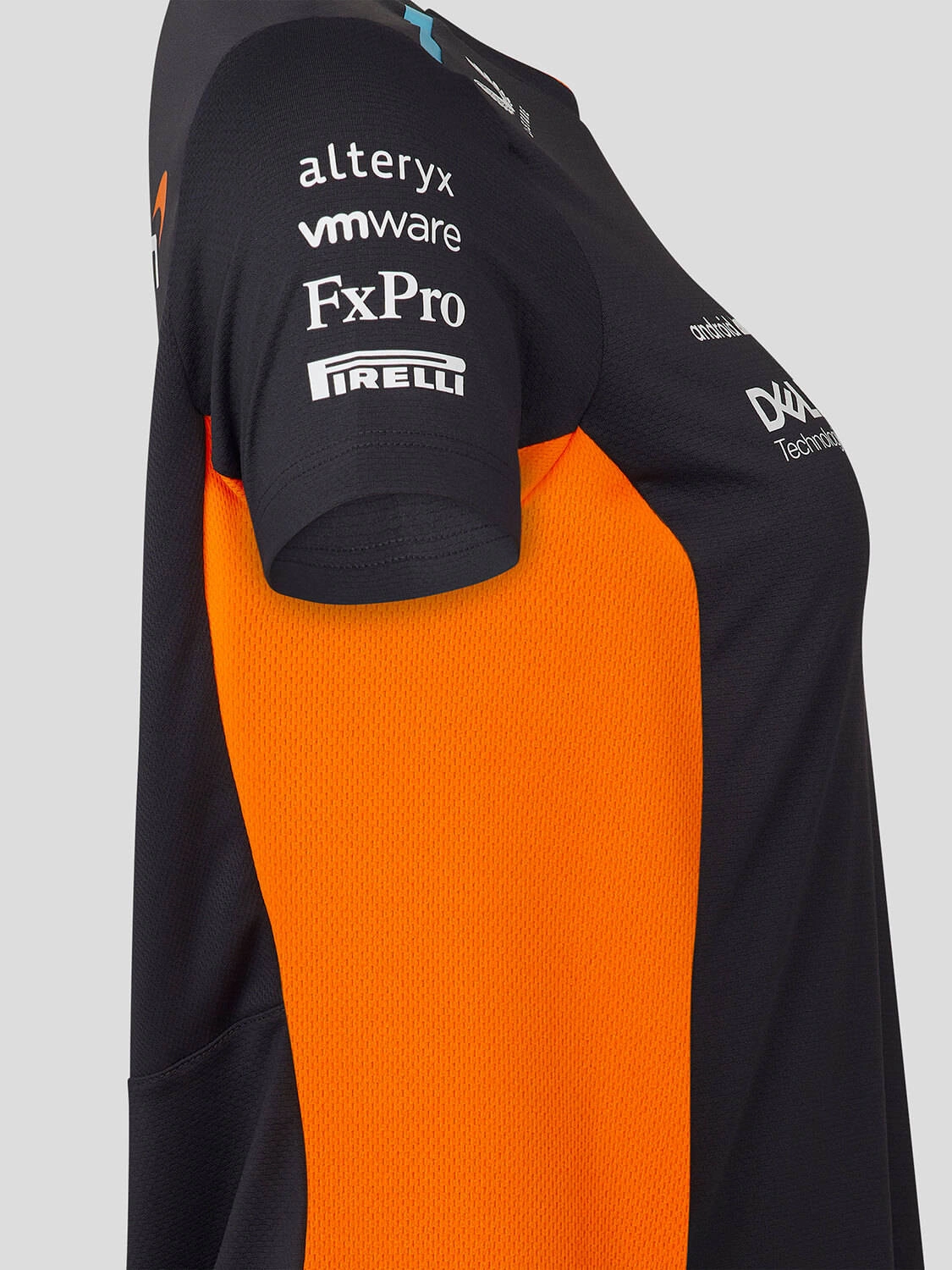 Official Women's version of Lando Norris' Castore x McLaren F1 2023 Driver T-shirt, part of the Teamline range as worn by Lando during F1 race weekends. The Women's Norris T-shirt comes in a female friendly fit with all the official McLaren F1 team and sponsor logos from the 2023 F1 season, alongside Lando's 2023 driver number: 4.