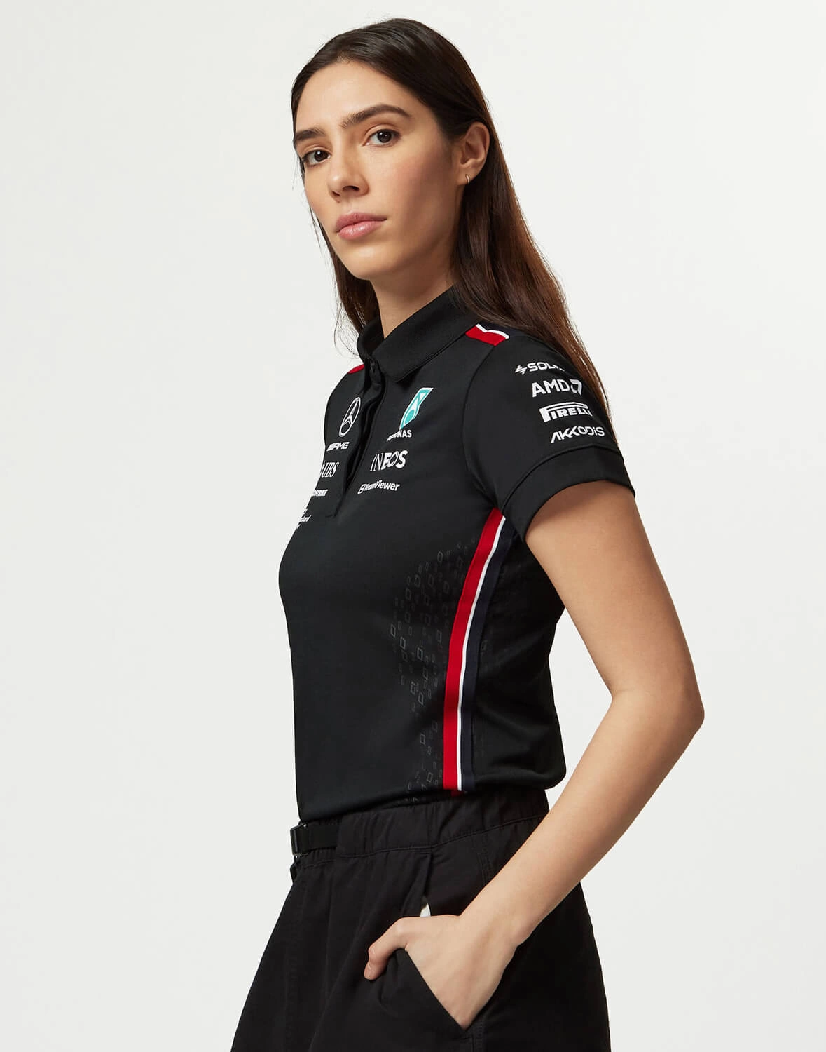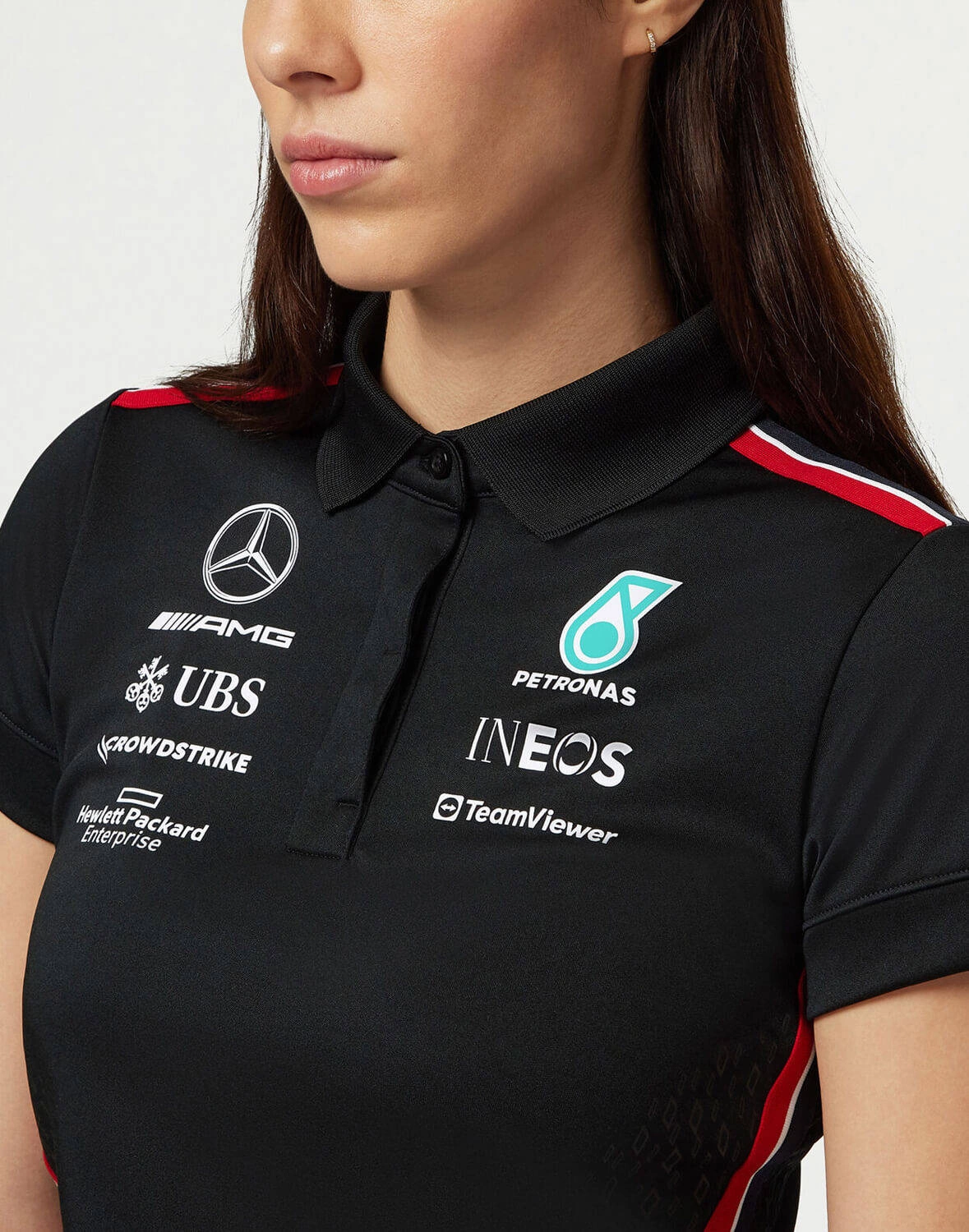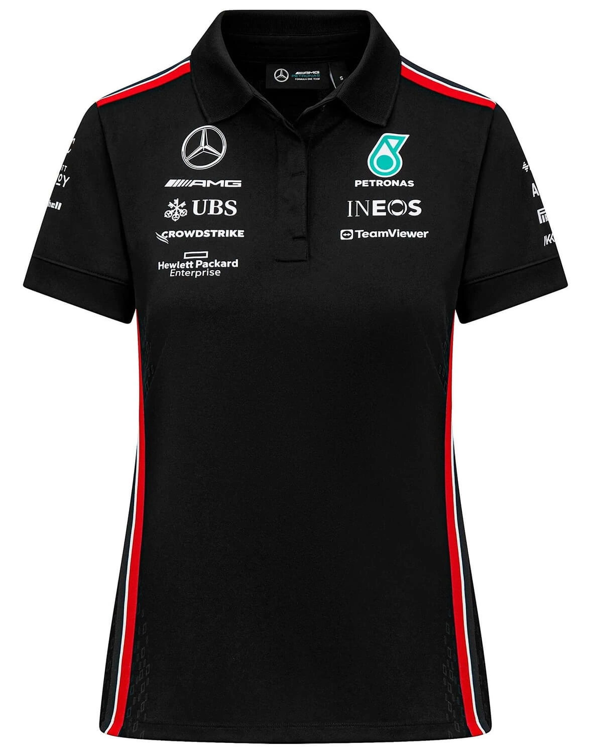 Timeless, classic motorsport design. Get behind the Mercedes-AMG Petronas F1 Team on and off the track with the official Women's 2023 Team Polo. The Women's version features the same official team and sponsor branding from the 2023 F1 season in a female friendly fit, with the traditional collar and button placket, with short sleeves.