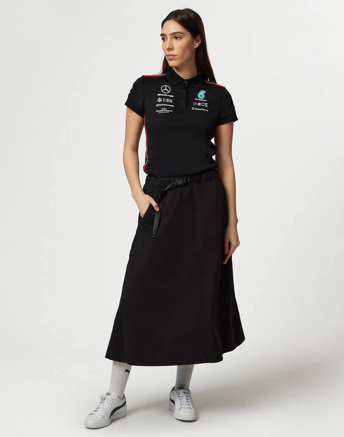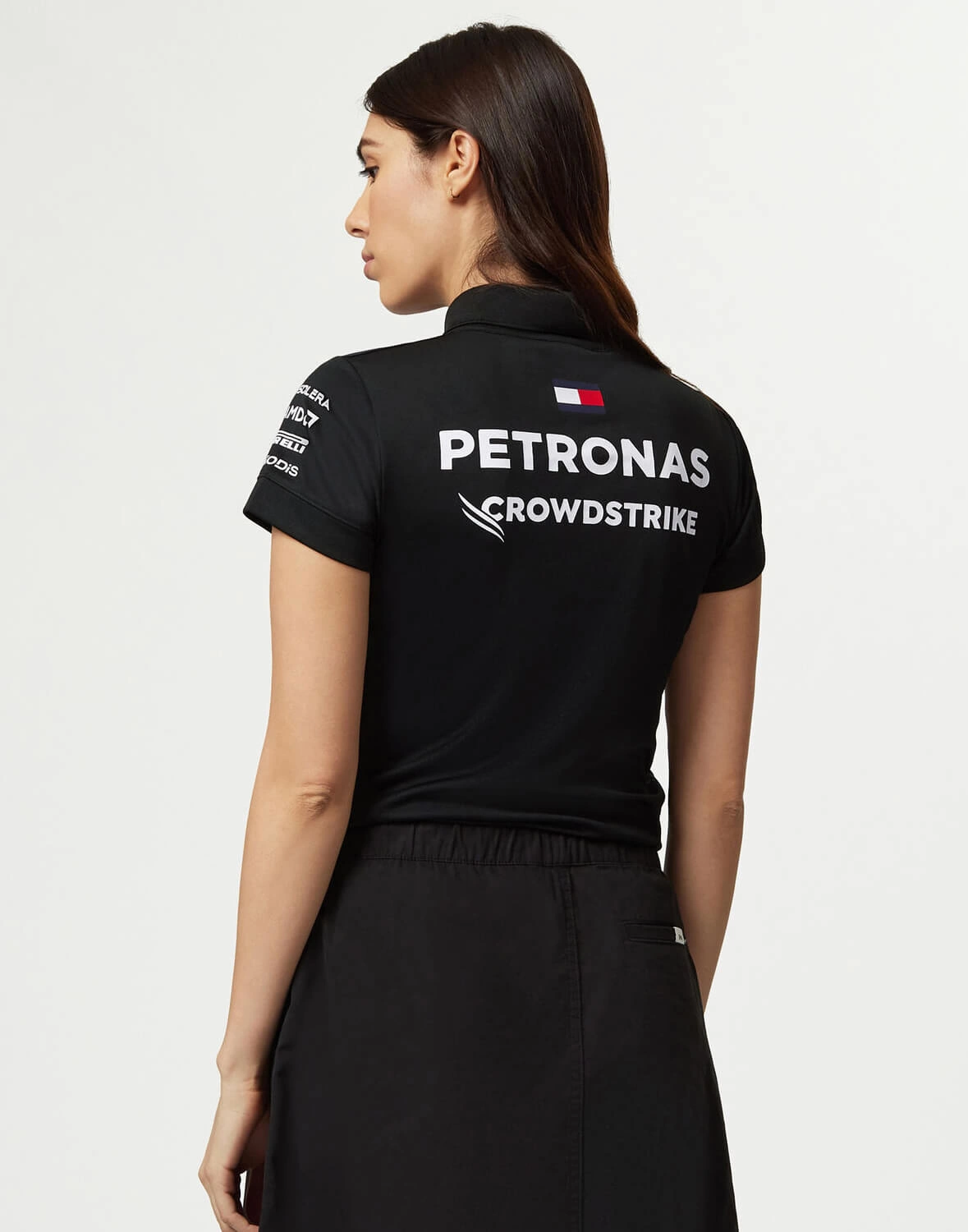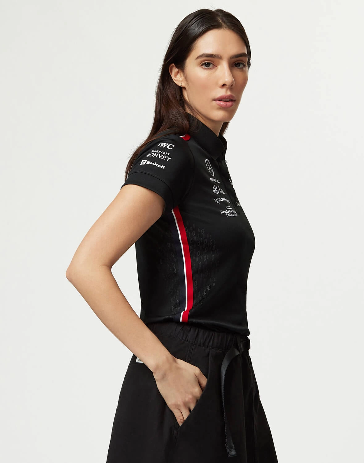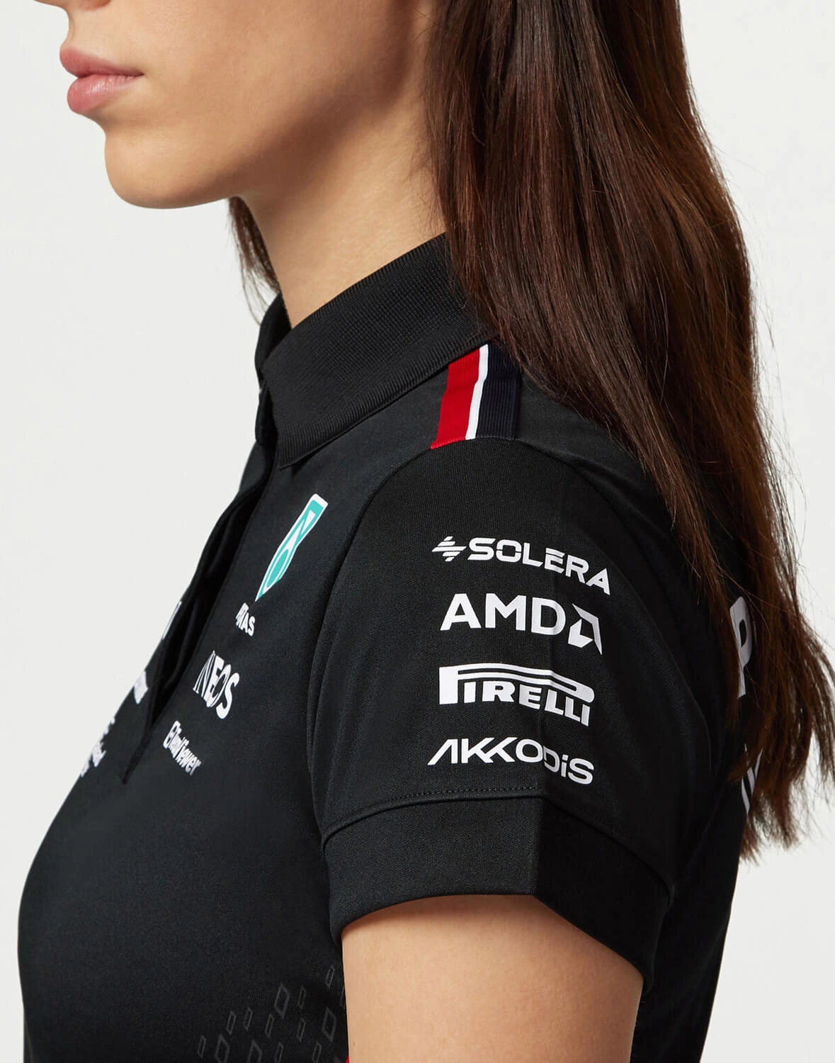 Timeless, classic motorsport design. Get behind the Mercedes-AMG Petronas F1 Team on and off the track with the official Women's 2023 Team Polo. The Women's version features the same official team and sponsor branding from the 2023 F1 season in a female friendly fit, with the traditional collar and button placket, with short sleeves.