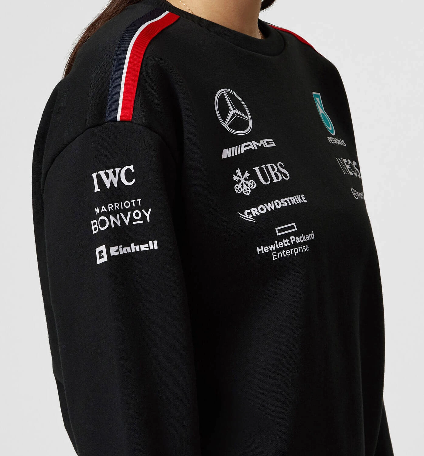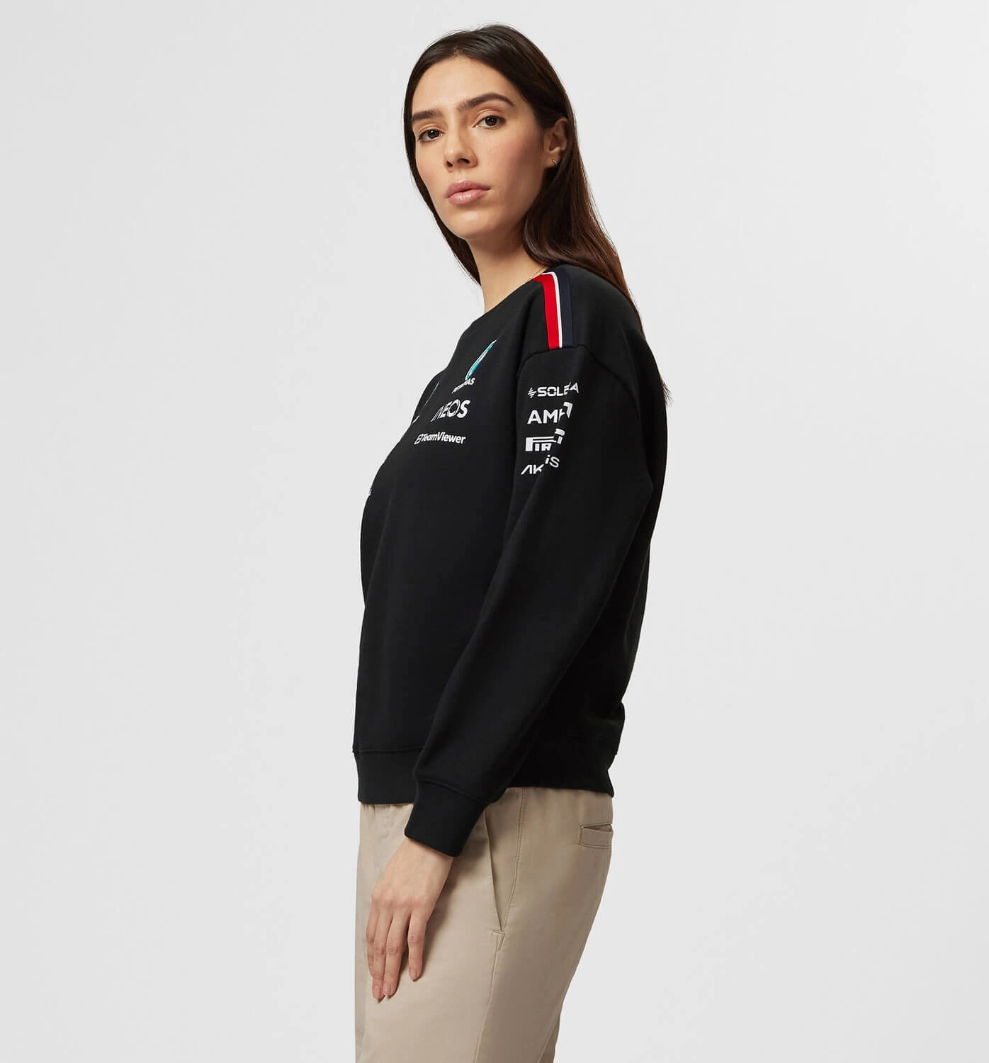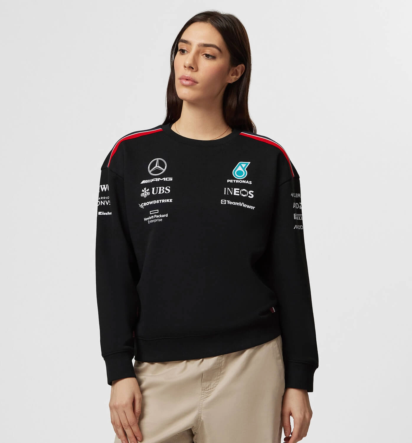 The perfect addition to your team collection, and part of the 2023 women's teamwear range. A classic sweatshirt in a female friendly fit with a crew neck and team and sponsor branding, as seen across all the Mercedes-AMG Petronas F1 Team range during the 2023 F1 season.