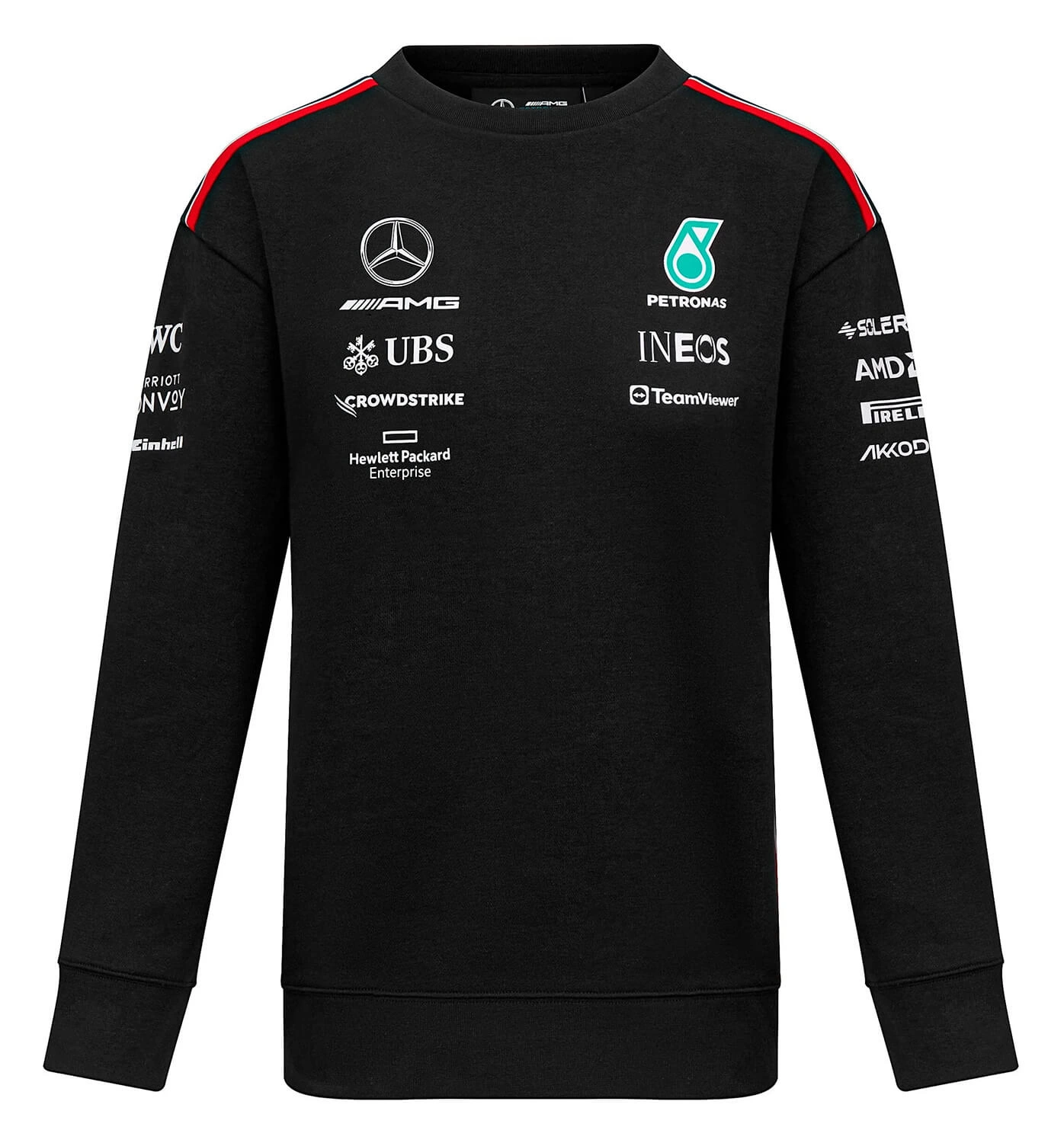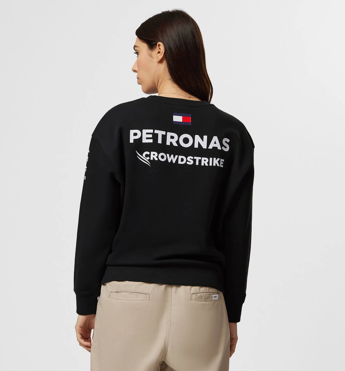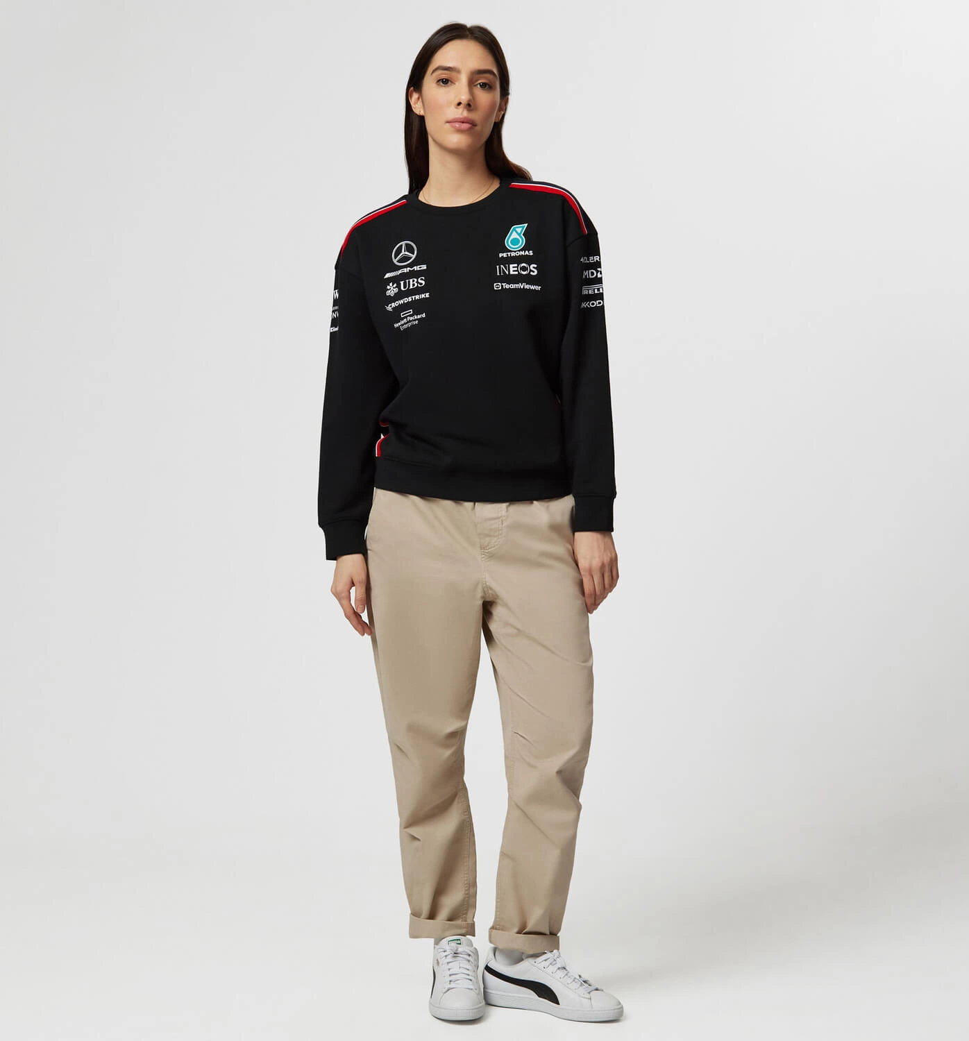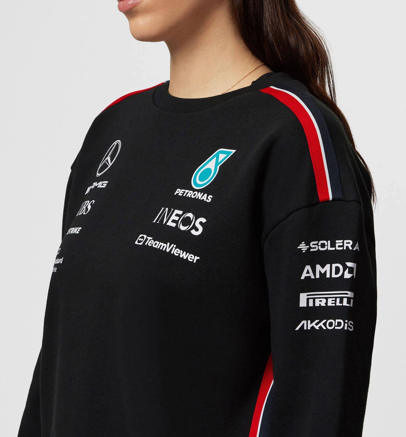 The perfect addition to your team collection, and part of the 2023 women's teamwear range. A classic sweatshirt in a female friendly fit with a crew neck and team and sponsor branding, as seen across all the Mercedes-AMG Petronas F1 Team range during the 2023 F1 season.