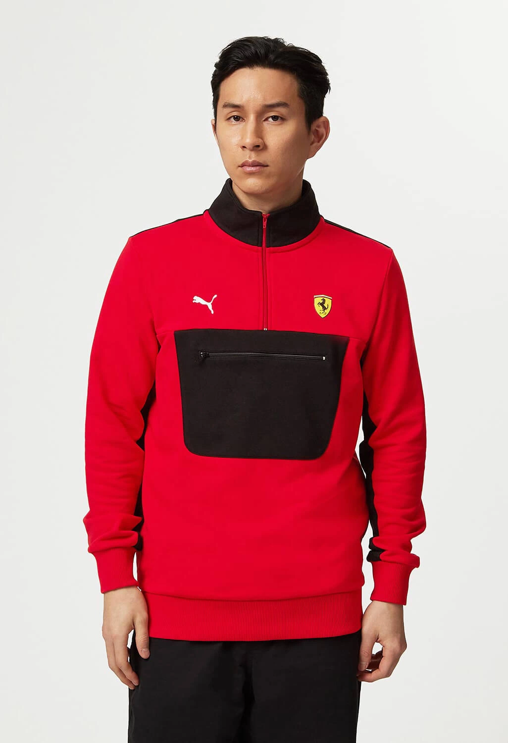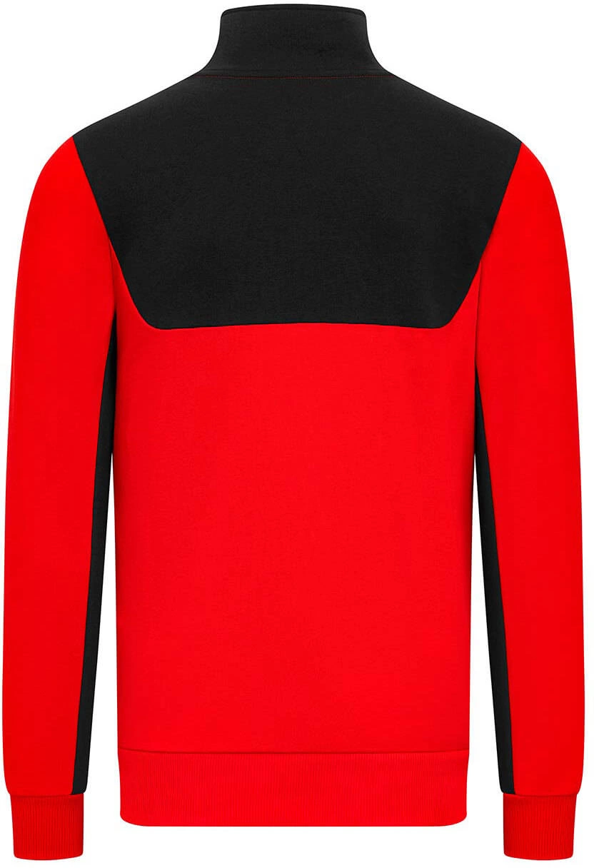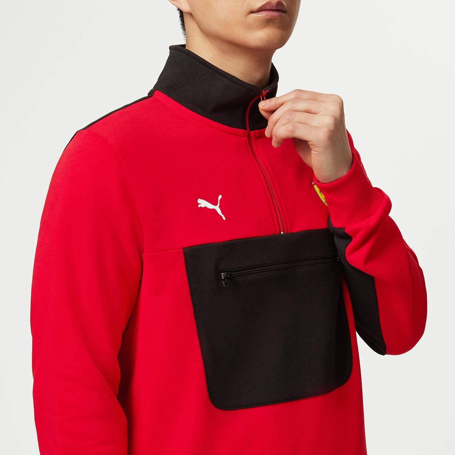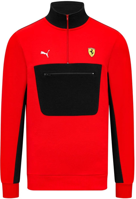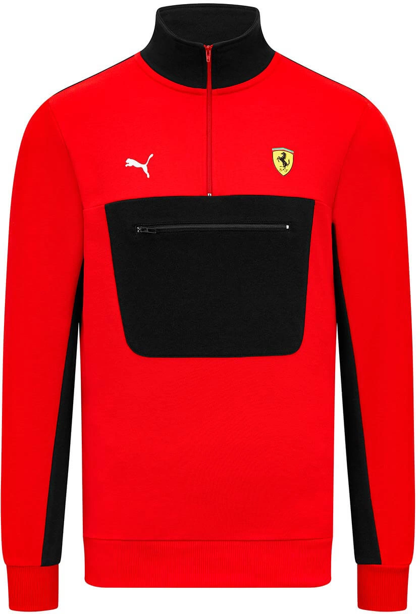 Official PUMA Scuderia Ferrari Quarter Zip Sweatshirt, with zip pocket and contrast black and red panels inspired by the Scuderia Ferrari F1 car livery.