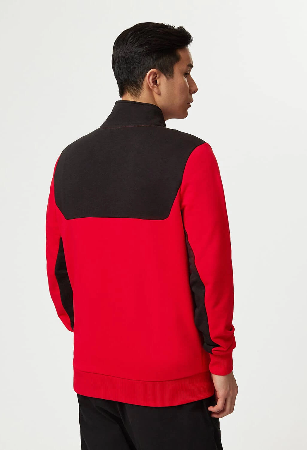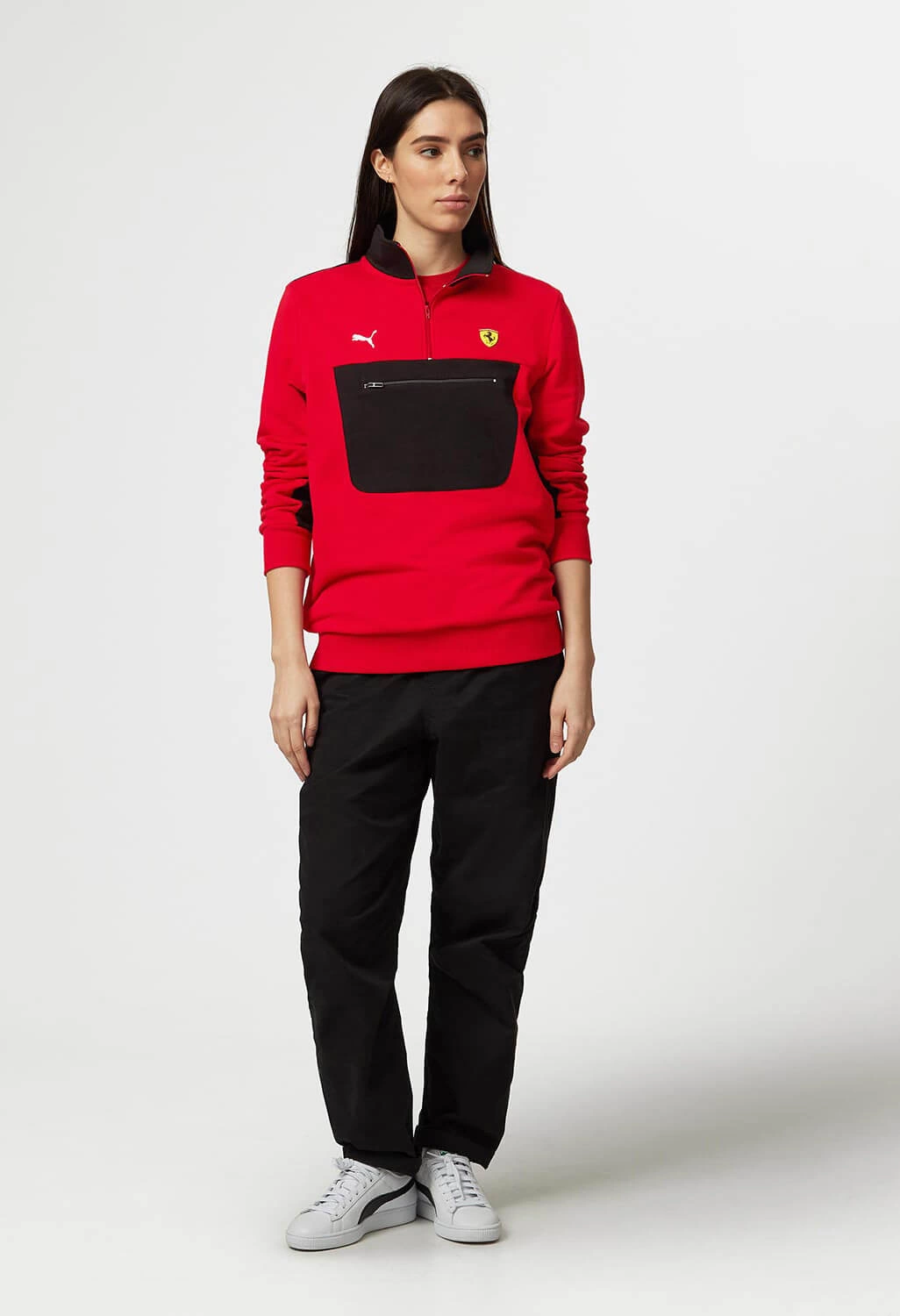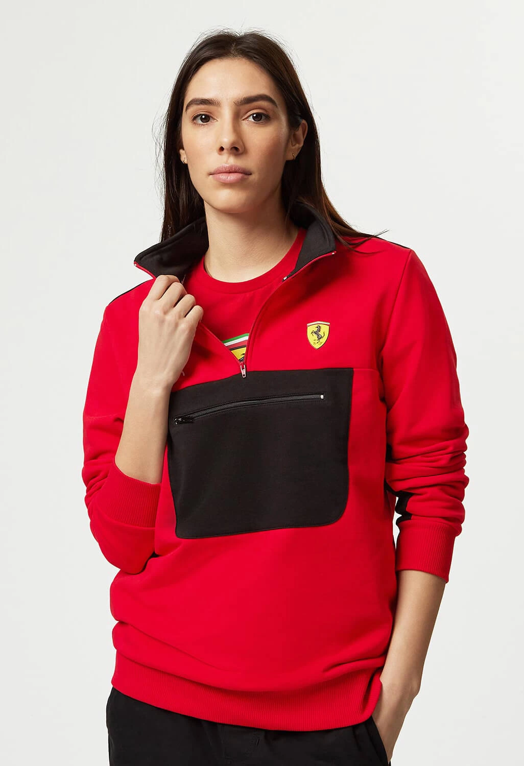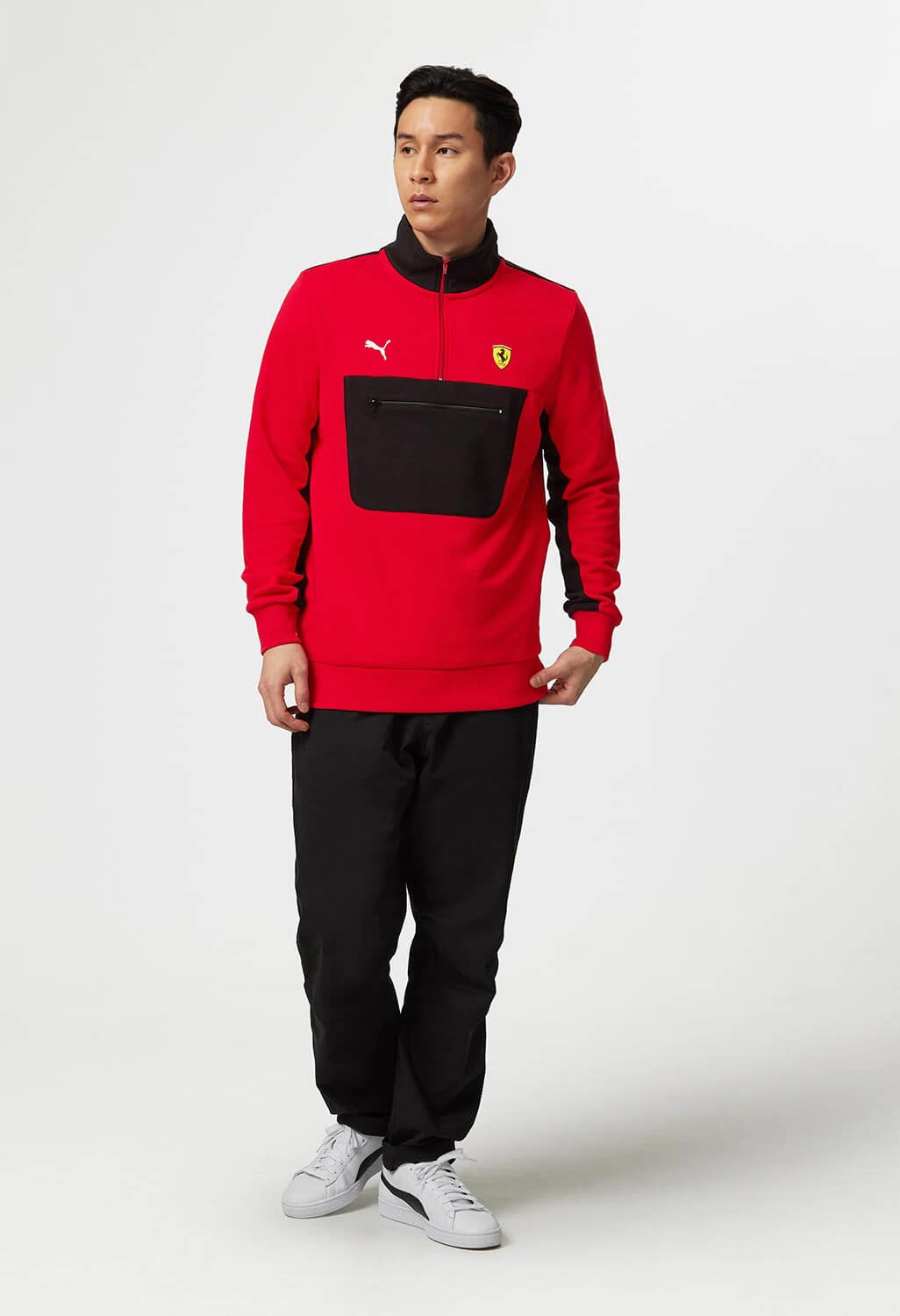 Official PUMA Scuderia Ferrari Quarter Zip Sweatshirt, with zip pocket and contrast black and red panels inspired by the Scuderia Ferrari F1 car livery.