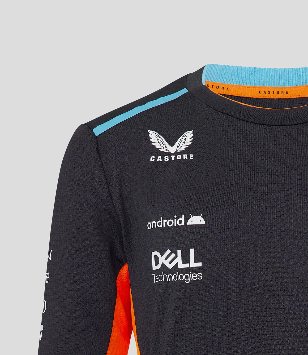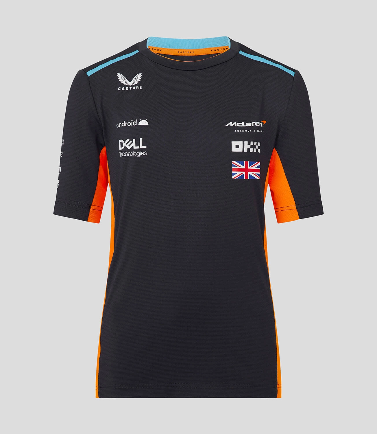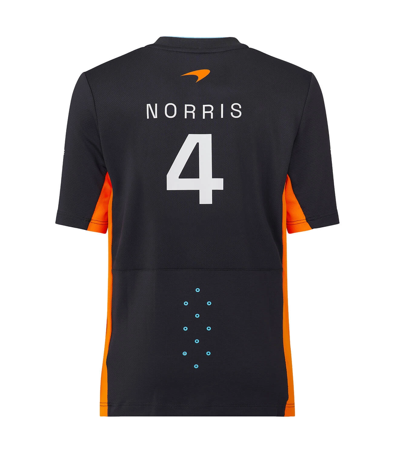 Show your support for F1 sensation Lando Norris with the Junior McLaren Set Up T-Shirt. Made with a lightweight and breathable fabric, this T-Shirt features a ribbed collar with contrasting colours and laser-cut and mesh ventilation for enhanced breathability. This T-Shirt showcases the McLaren Formula 1 Team logo and sponsor logos, as well as Norris’ name and number on the reverse, and national flag and signature on the front. Get ready to cheer on your favourite team in style with this must-have T-Shirt.