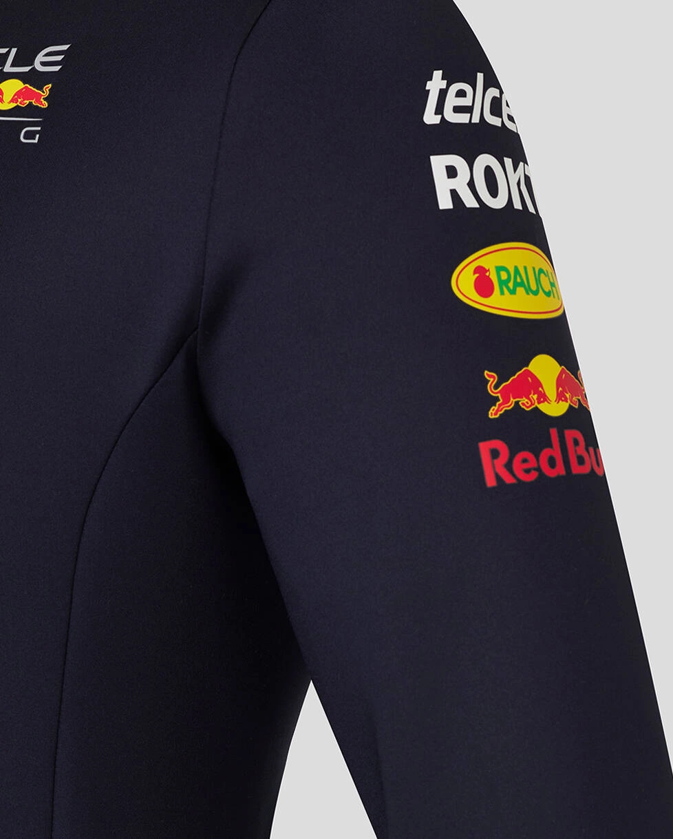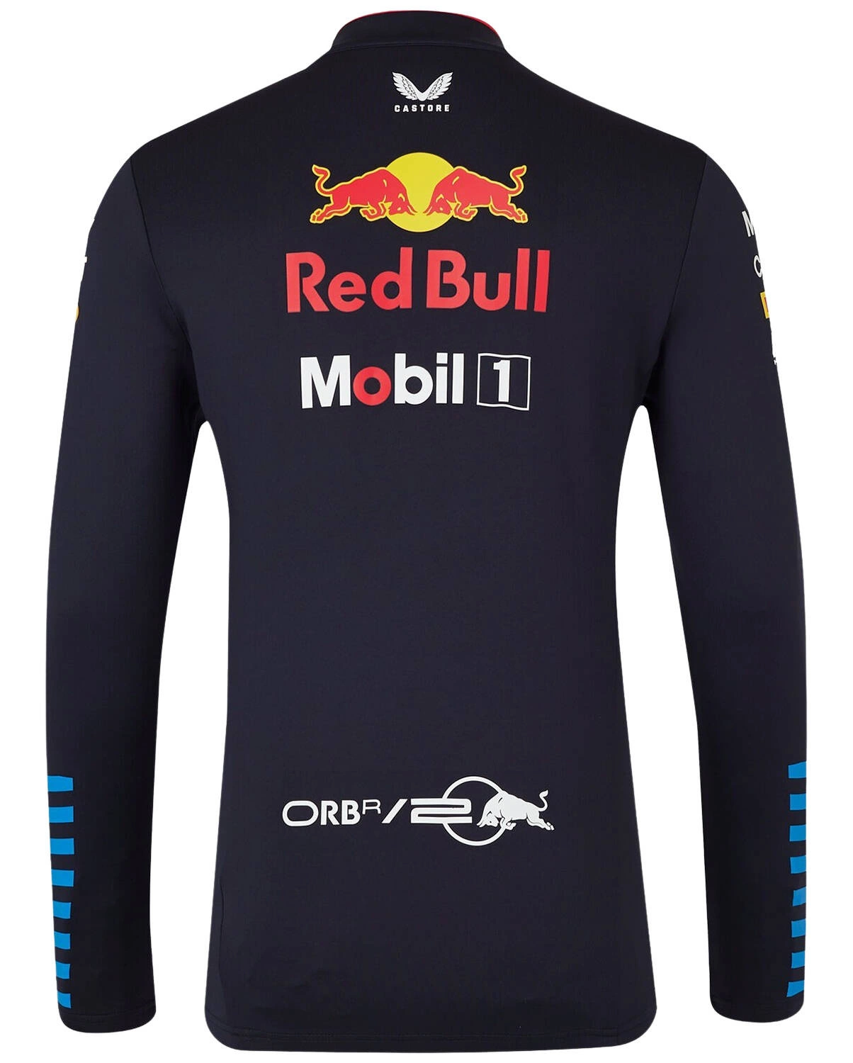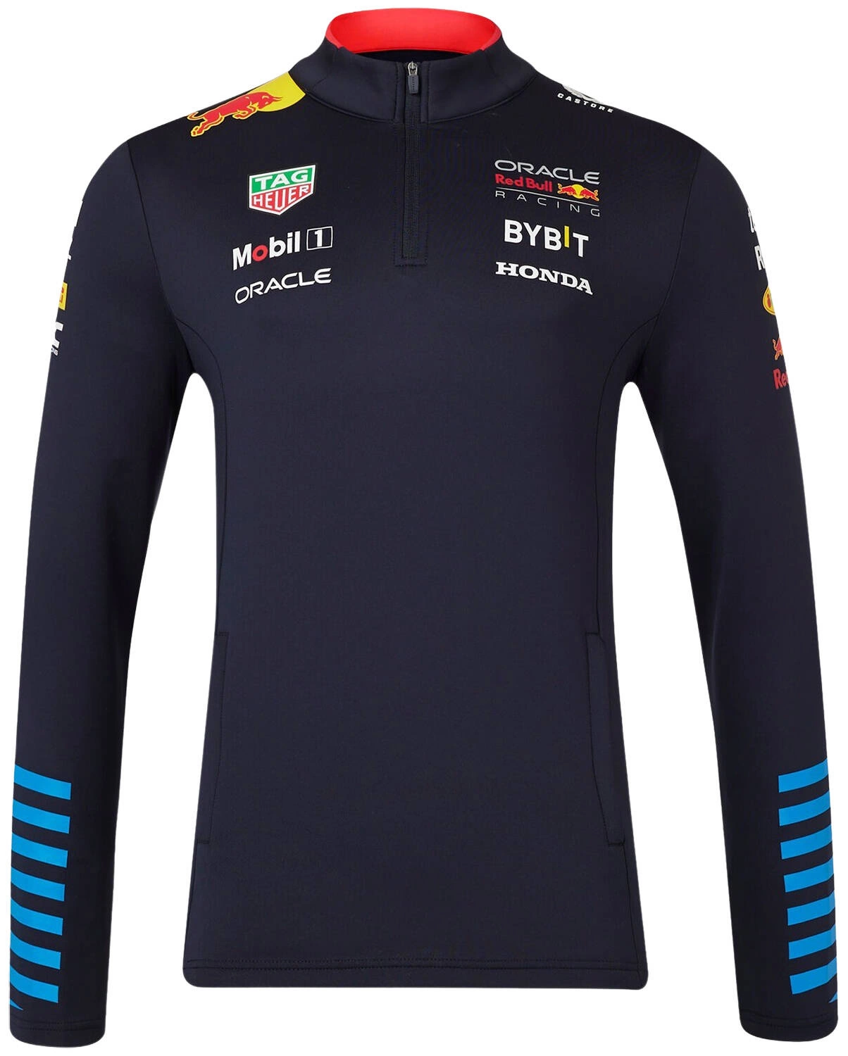 The Oracle Red Bull Racing Midlayer Technical Sweatshirt ensures moisture control by efficiently wicking it away. Crafted from exceptionally soft and breathable polyester fabric, it provides comfort and warmth on cooler days. It retains heat and absorbs moisture generated during physical activity, preventing overheating. Excellently suited as a midlayer or standalone garment for physical activities. The sweatshirt contains the Oracle Red Bull Racing logo and sponsors, as well as a special print on the back commemorating the twentieth season of the team in Formula 1.