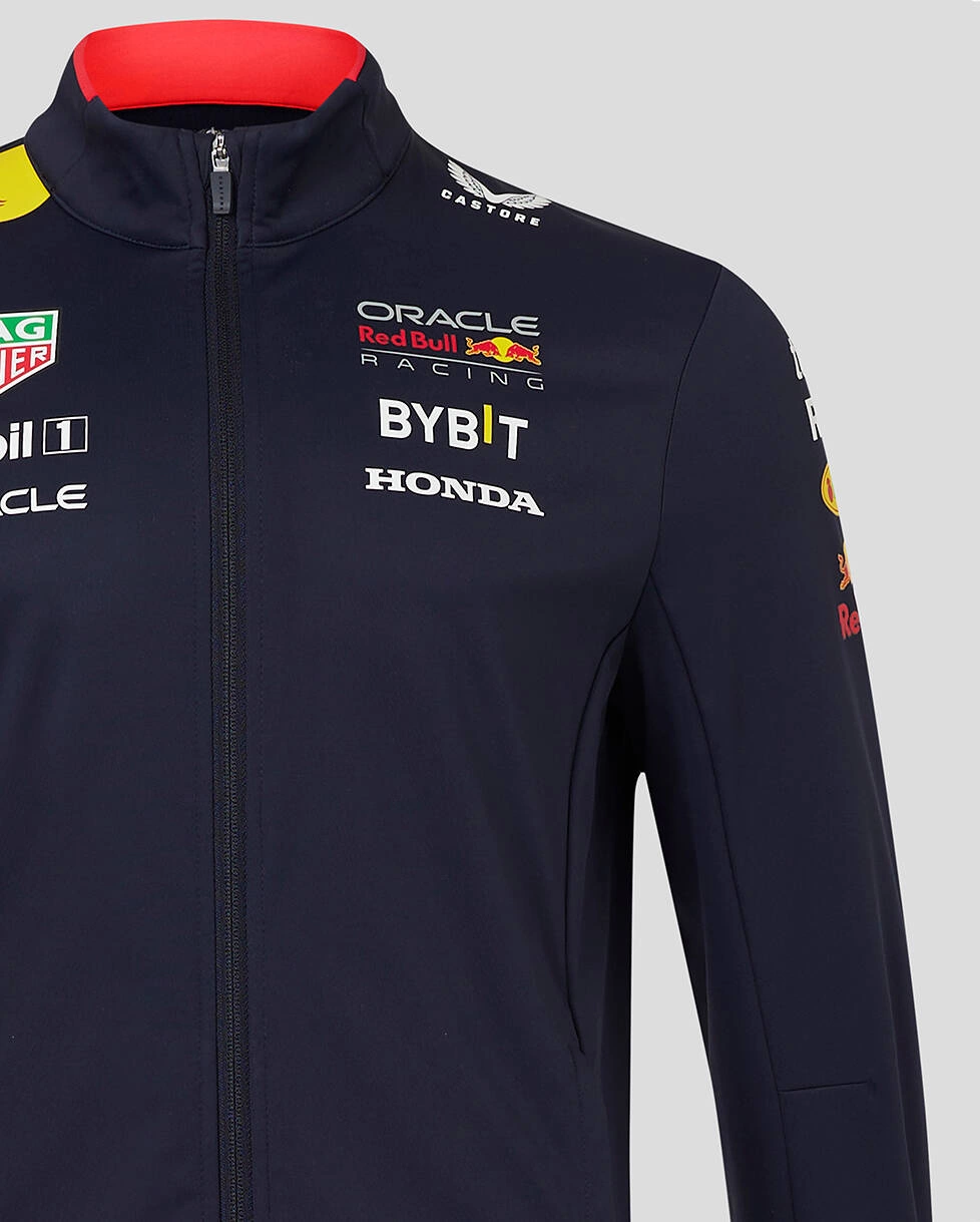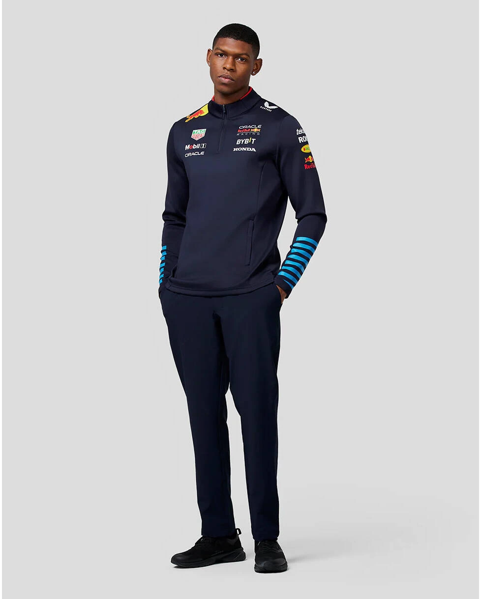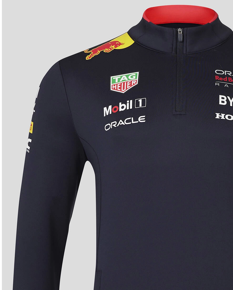 The Oracle Red Bull Racing Midlayer Technical Sweatshirt ensures moisture control by efficiently wicking it away. Crafted from exceptionally soft and breathable polyester fabric, it provides comfort and warmth on cooler days. It retains heat and absorbs moisture generated during physical activity, preventing overheating. Excellently suited as a midlayer or standalone garment for physical activities. The sweatshirt contains the Oracle Red Bull Racing logo and sponsors, as well as a special print on the back commemorating the twentieth season of the team in Formula 1.