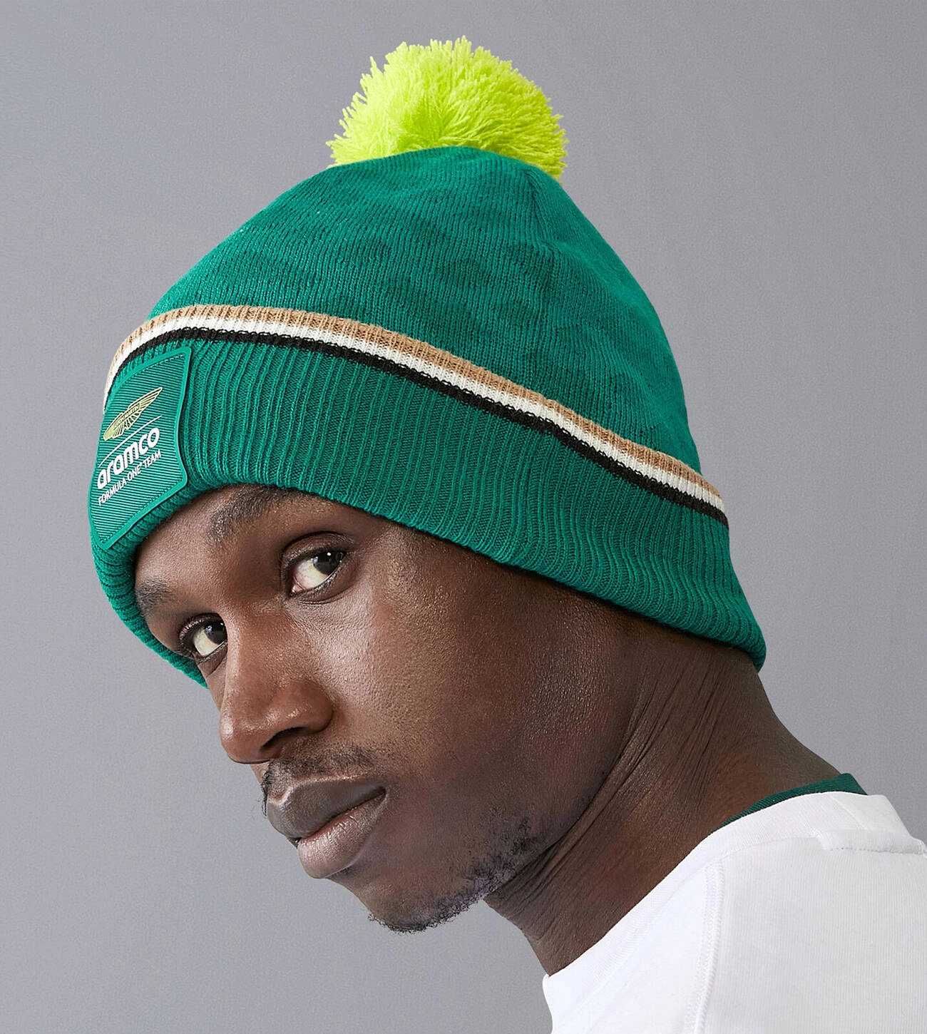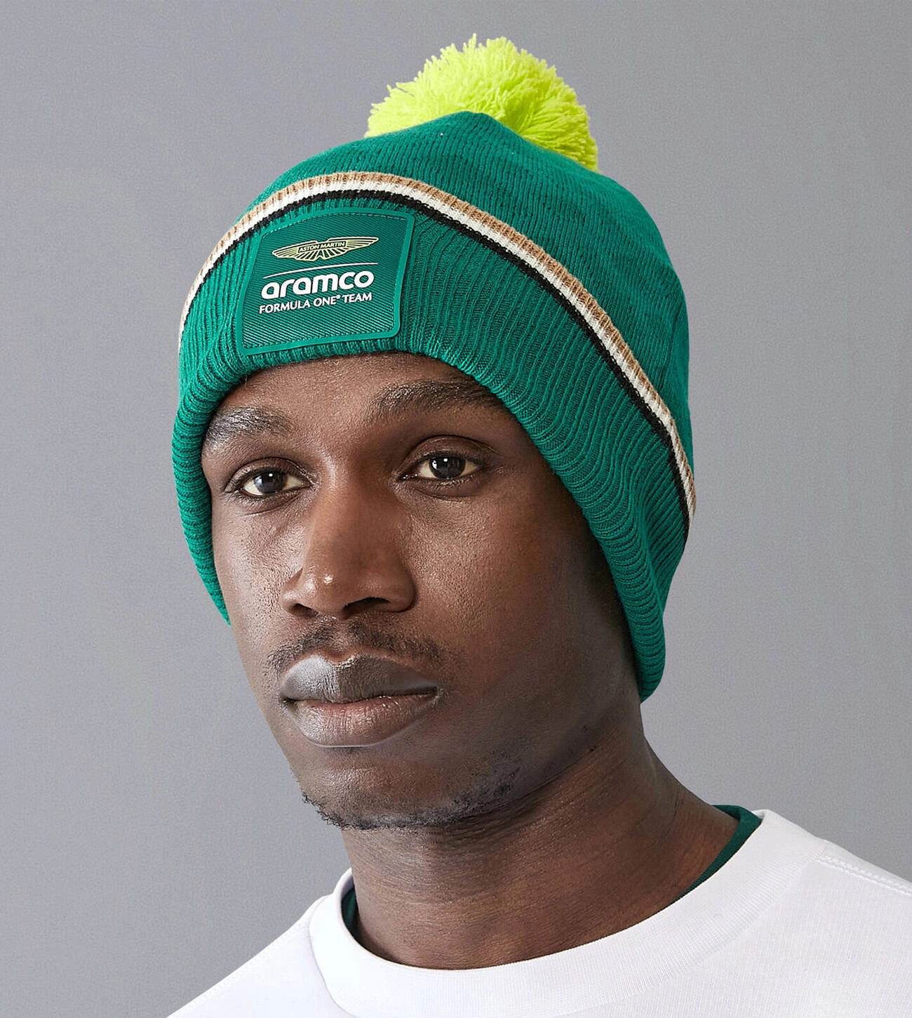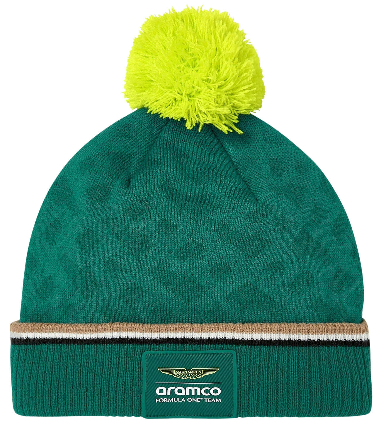 The Aston Martin Aramco Formula One Official Team Beanie for the 2024 F1 season. Made from technologically advanced acrylic and adorned with contrasting knit details, it provides both warmth and luxurious comfort.