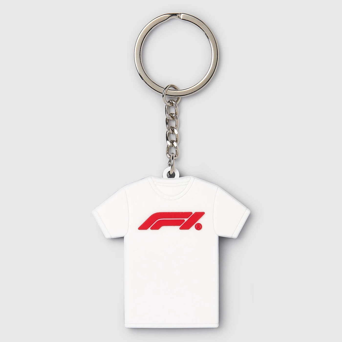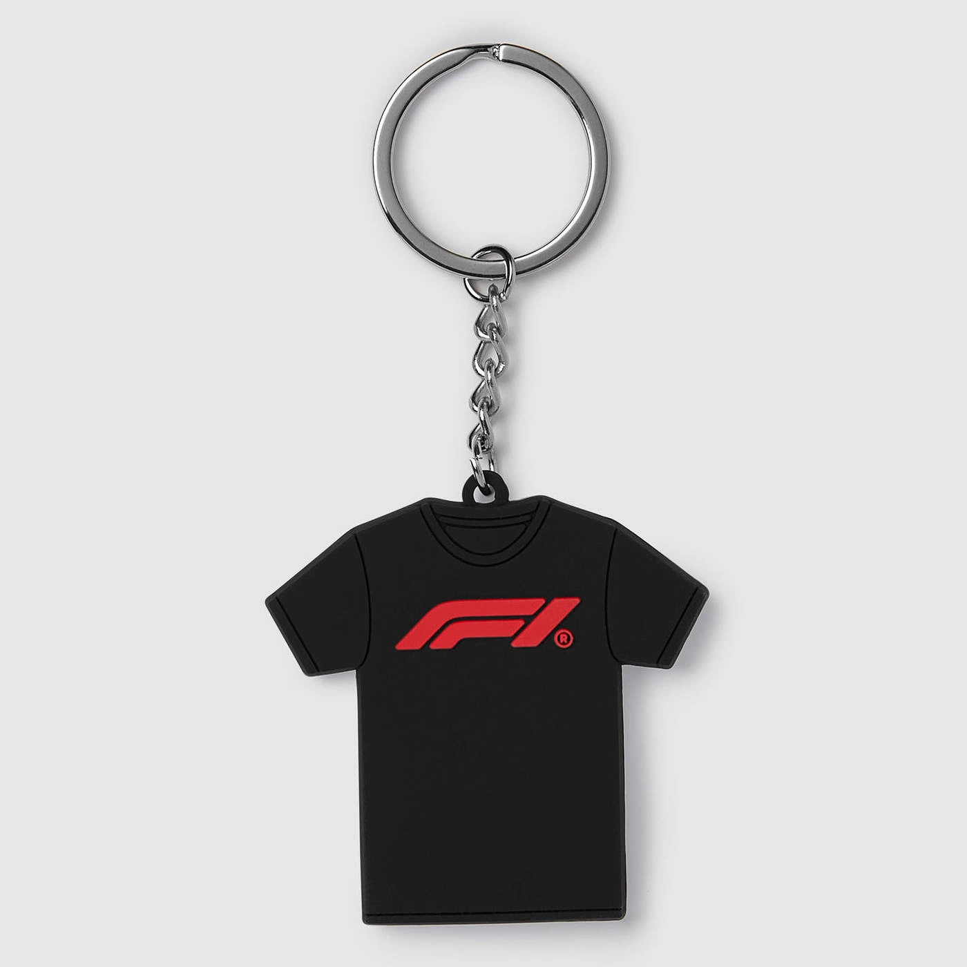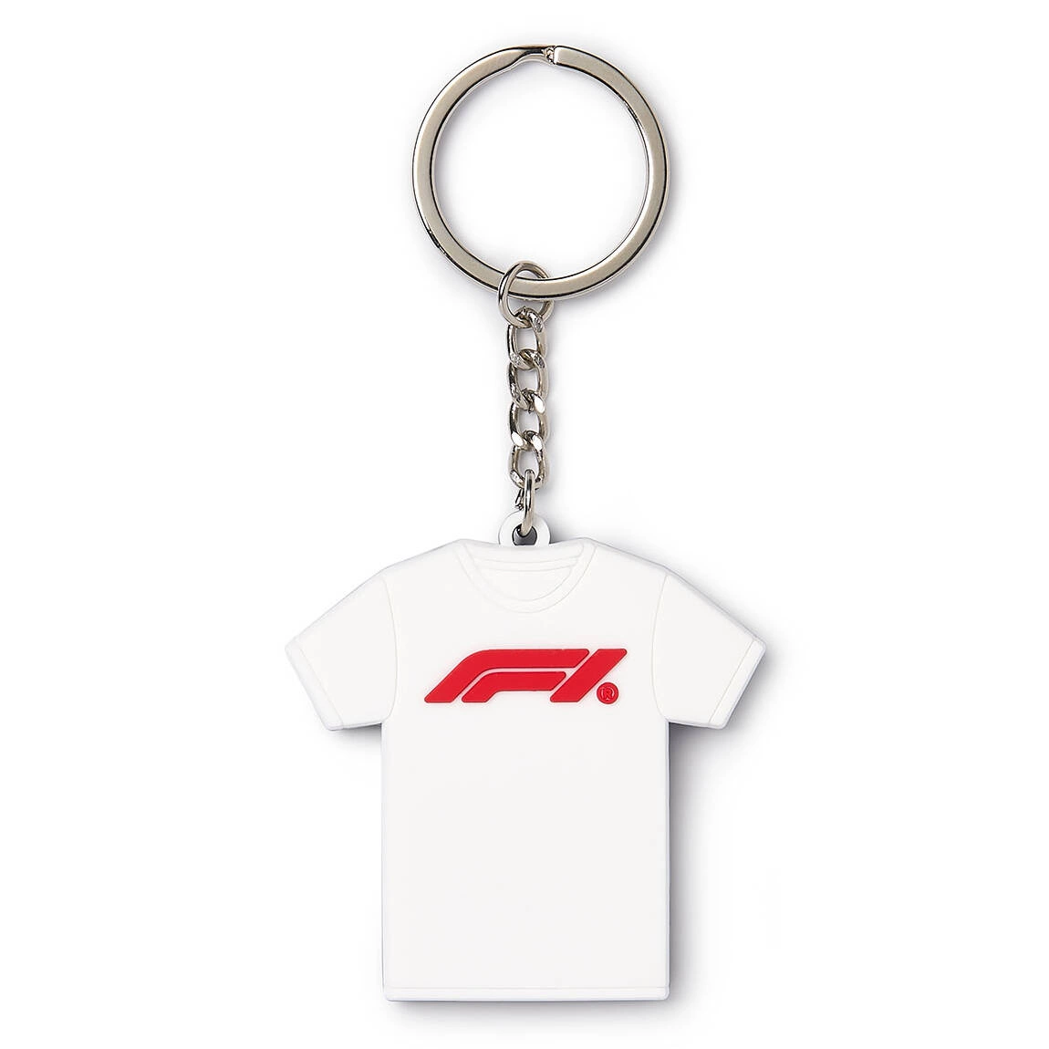 Officially licensed keychain with a miniature T-shirt featuring the F1 logo.