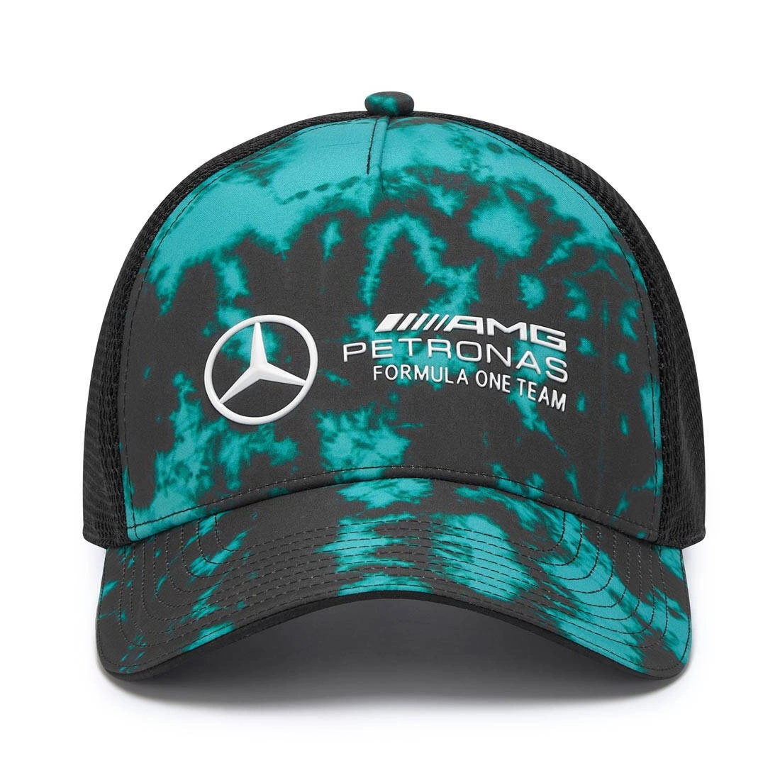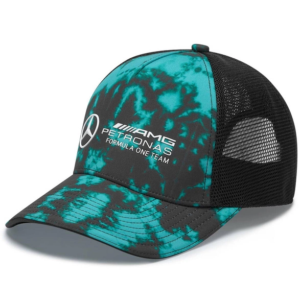 The Mercedes-AMG F1 Tie Dye Trucker cap stands out with its unique character thanks to the distinctive fabric dyeing process. As a result, no two caps are alike, making each piece unique. The front features a large team logo, highlighting your support for Mercedes AMG Petronas F1. The mesh back and sides ensure proper ventilation, while the adjustable closure provides a fit for any head size.