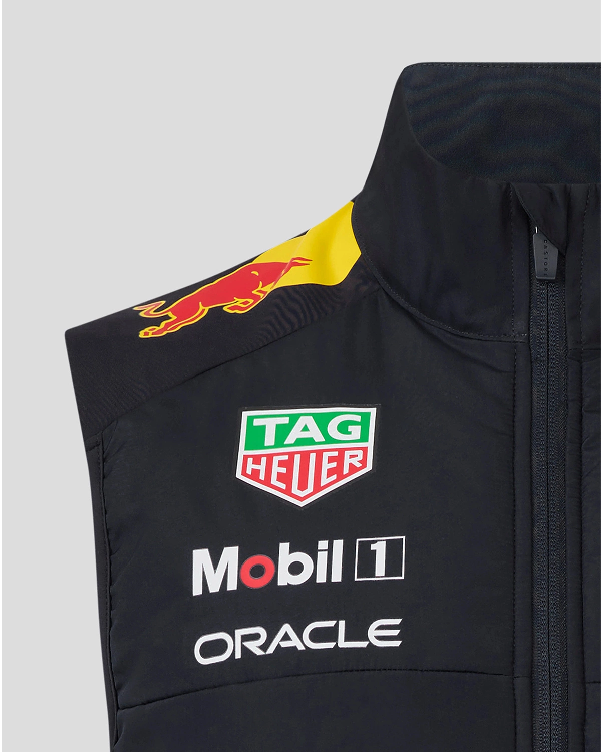 The official Oracle Red Bull Racing Team Hybrid Gilet for the 2025 Formula 1 season protects against wind and cold, ensuring comfort in challenging weather conditions. Its lightweight and well-fitted design guarantees freedom of movement.