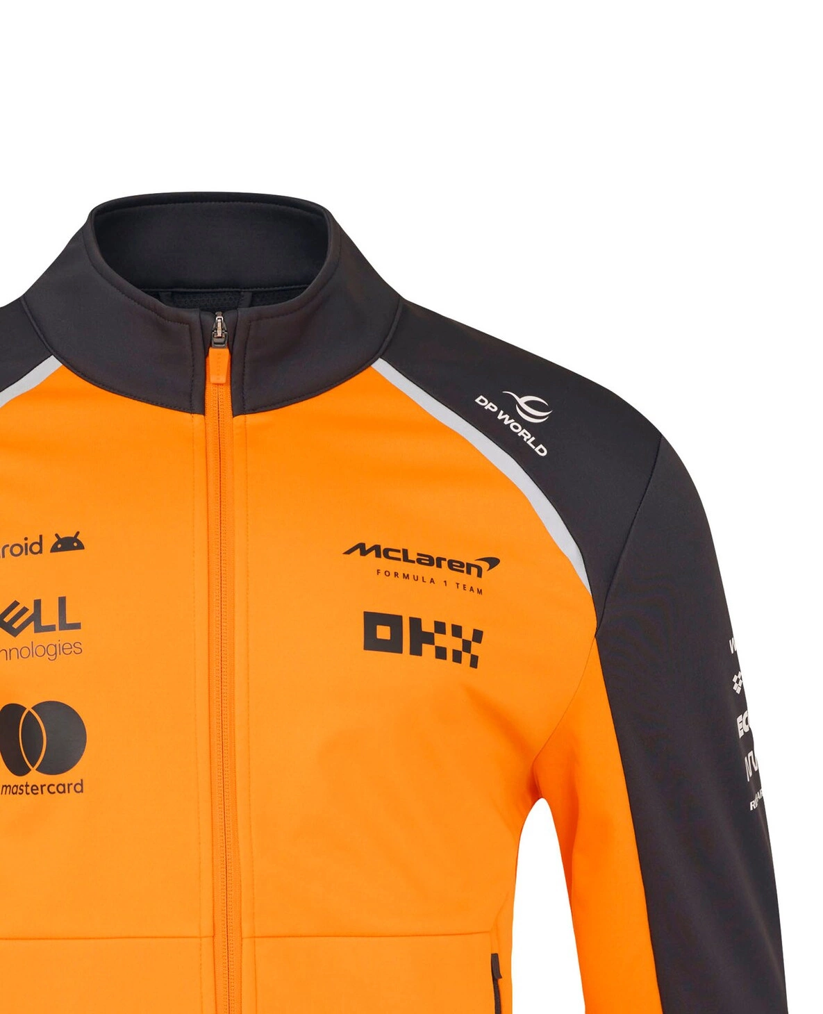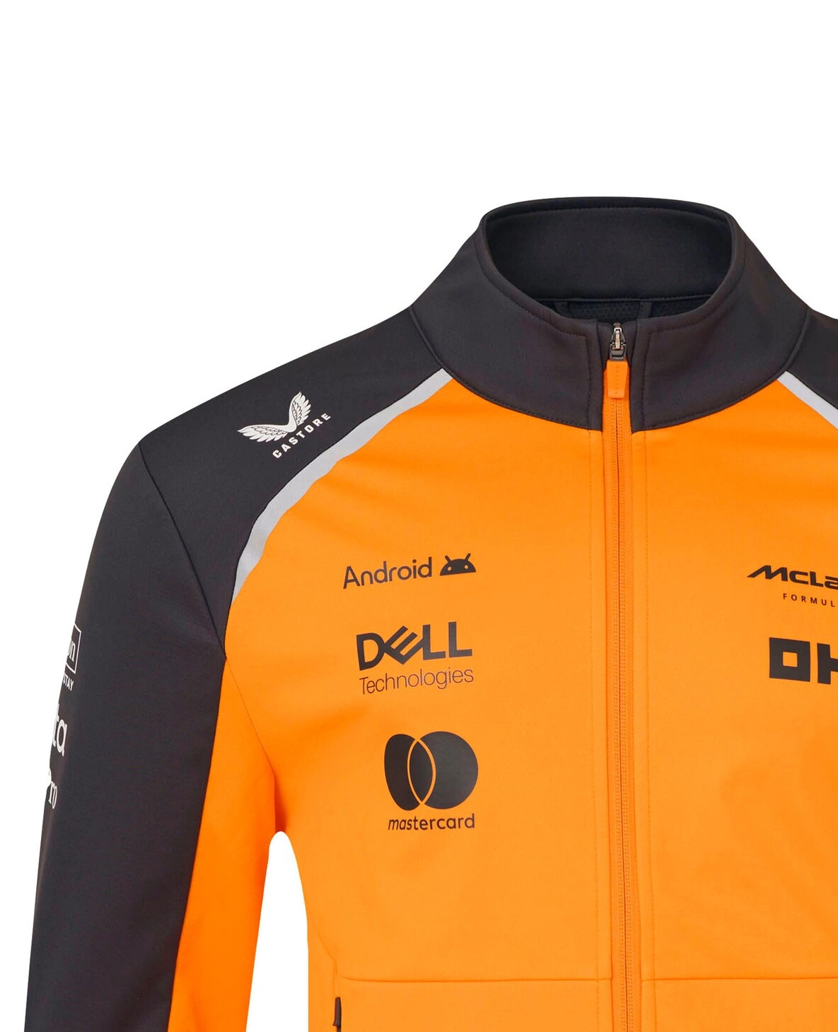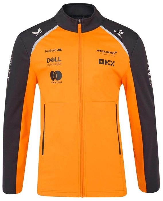 The official McLaren Formula 1 Team Softshell Jacket for the 2025 Formula 1 season combines functionality and style, making it perfect both on and off the track. Crafted from premium-quality materials, it provides effective protection against wind and light rain while ensuring full freedom of movement.