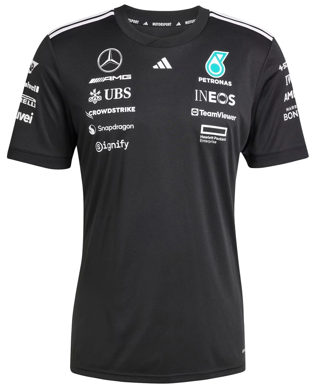 The official Mercedes-AMG Petronas Formula One Team T-shirt by adidas for the 2025 season. AEROREADY technology effectively wicks away moisture, ensuring comfort and breathability both on the track and in everyday wear. The Mercedes-AMG Petronas Formula One Team logo and sponsor logos emphasize its authentic character, while the three stripes on the shoulders and the adidas logo on the chest provide a signature finish.