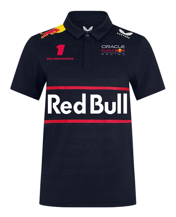 The official women's polo shirt of Oracle Red Bull Racing for the 2025 Formula 1 season combines a sporty character with elegance. Made from high-quality materials, it ensures comfort and freedom of movement throughout the day. The graphic on the chest proudly shows support for the reigning Formula 1 champion Max Verstappen.