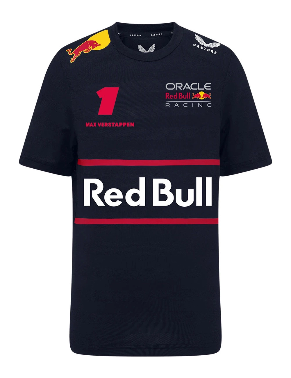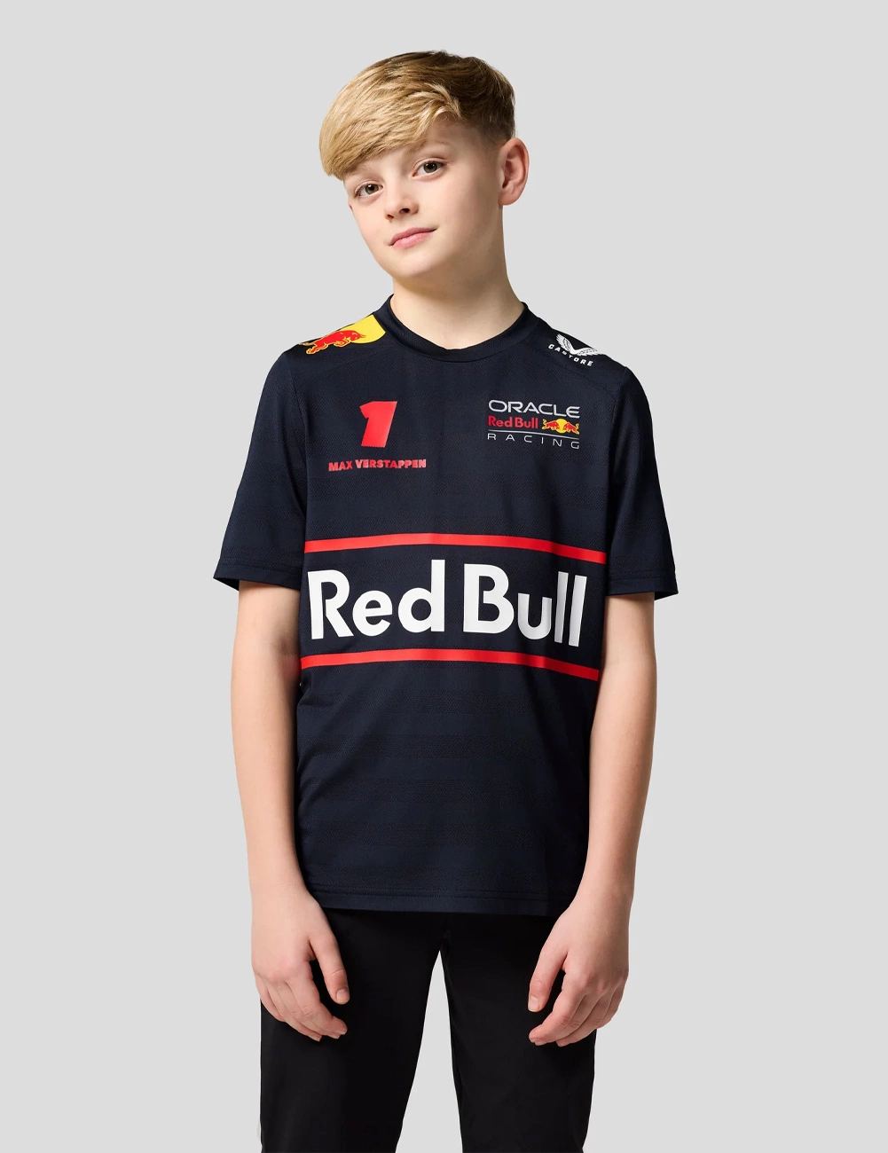 The official junior’s Oracle Red Bull Racing t-shirt for the 2025 Formula 1 season combines unique design with comfort. Made from high-quality materials, it provides comfort and freedom of movement throughout the day. The graphic on the chest proudly shows support for the reigning Formula 1 champion Max Verstappen.