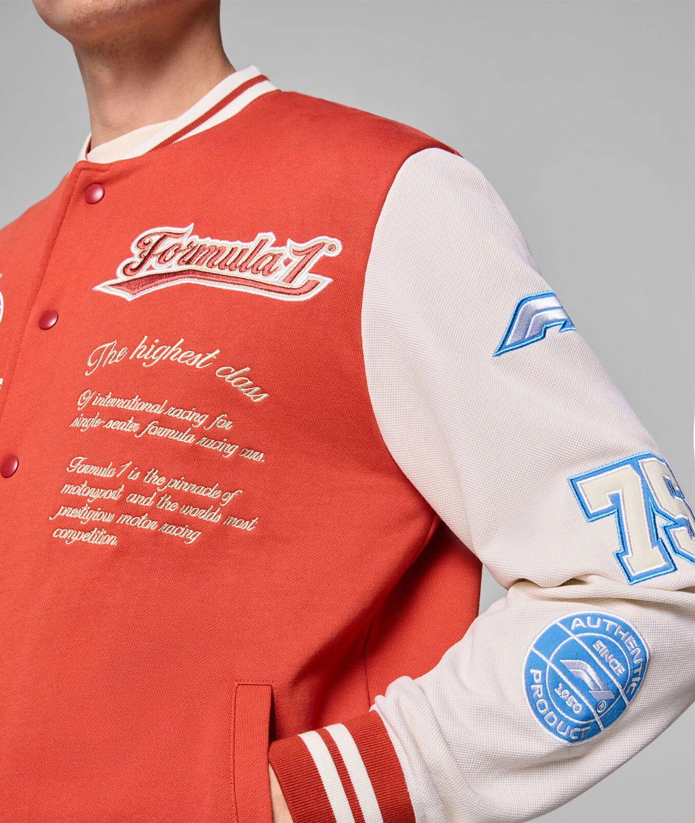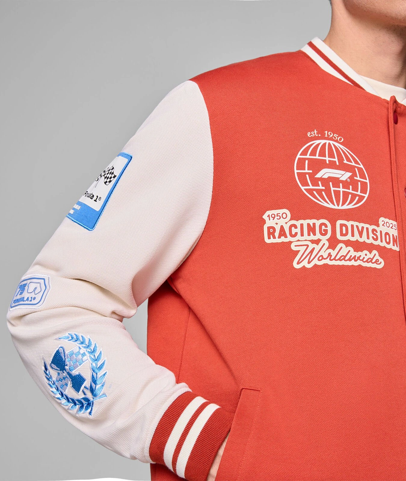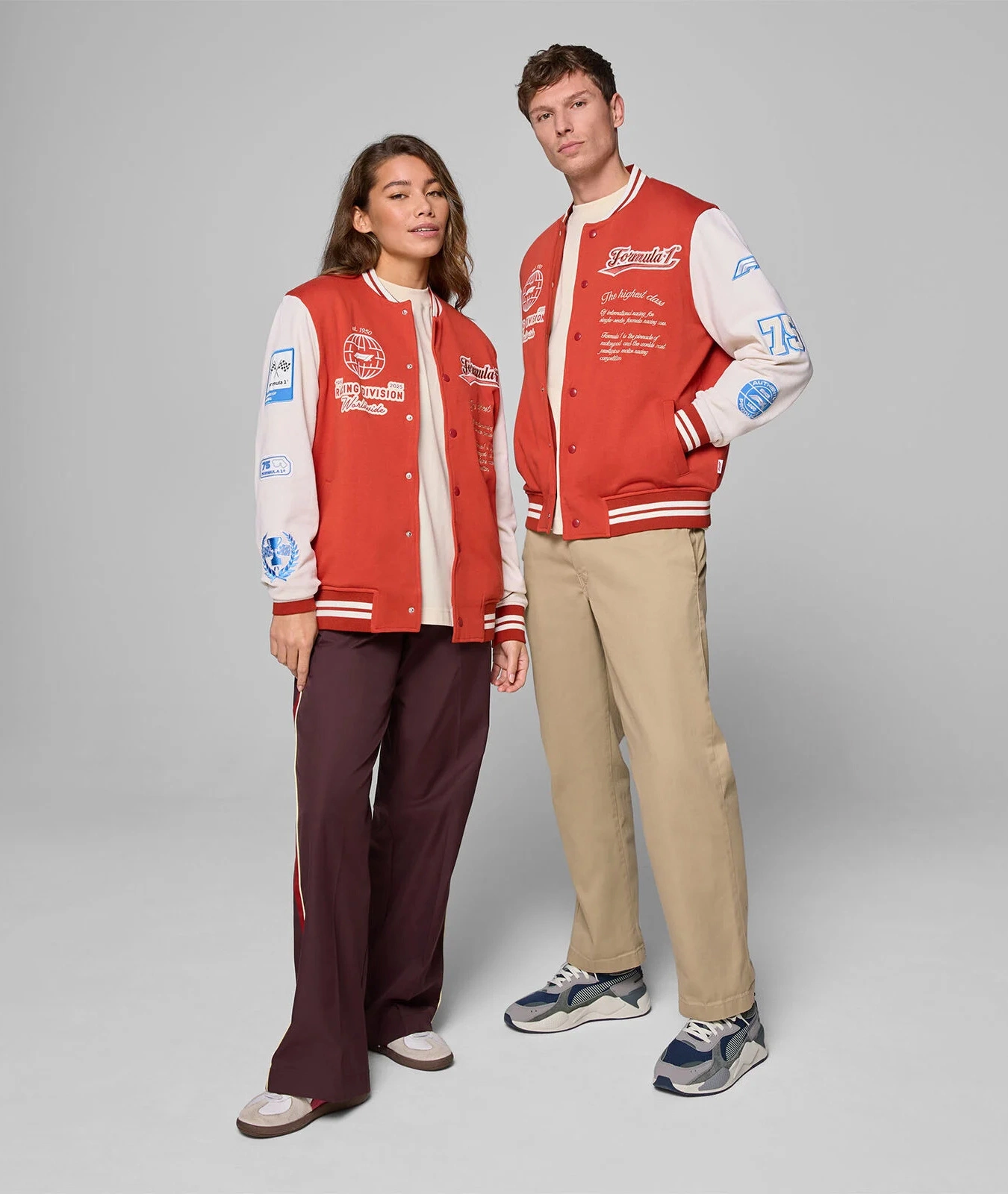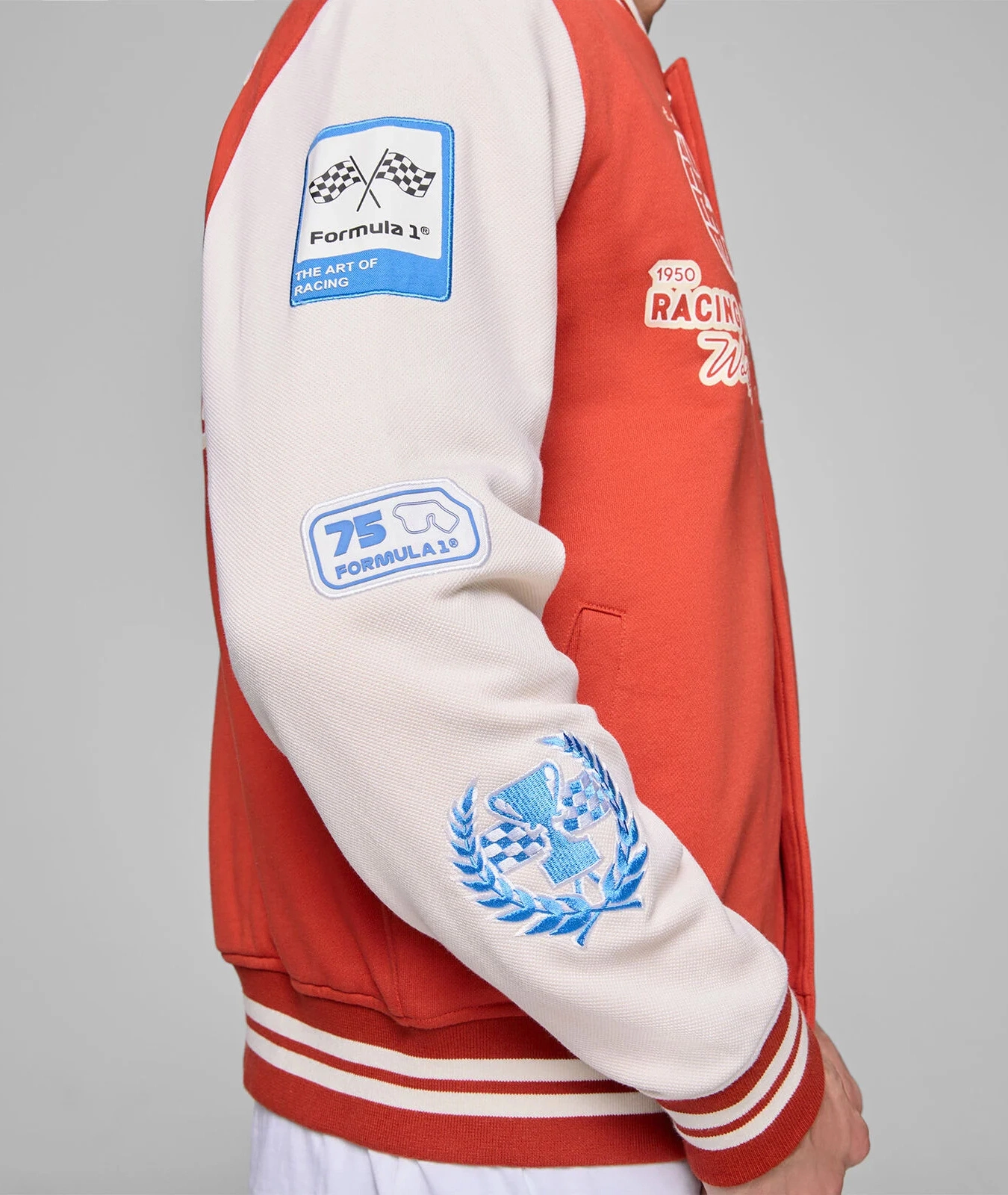 The F1 Heritage Varsity Jacket is a tribute to the 75th anniversary of Formula 1. Its loose fit and retro motifs, including patches and prints commemorating the F1 anniversary, give the jacket a unique, sporty character.