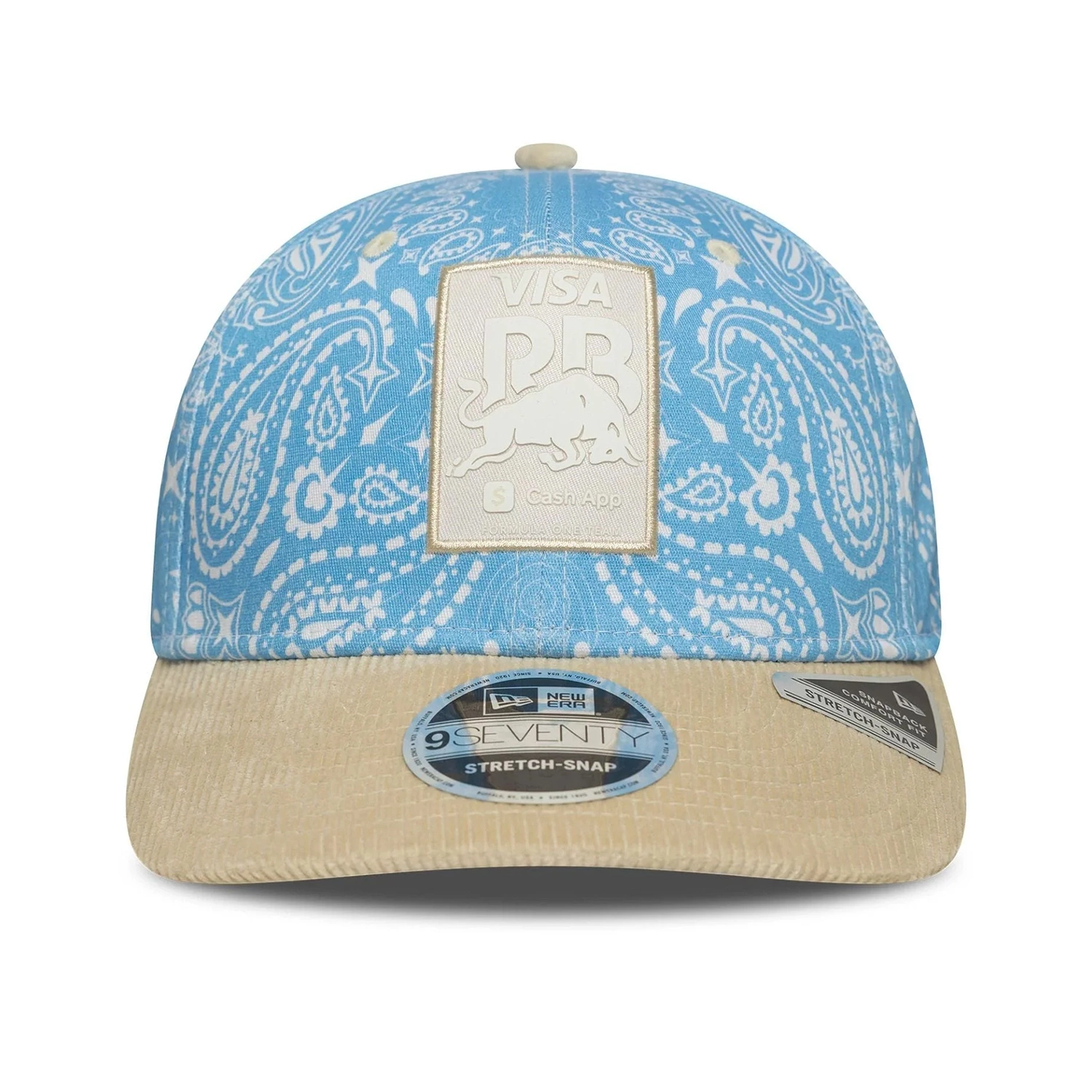 The official Visa Cash App RB Formula One Team cap by New Era, featuring a pastel blue crown paired with a beige corduroy visor. This 9Seventy design includes a structured front panel, curved brim, and adjustable closure for a comfortable, personalized fit. A must-have accessory for Formula 1 fans and supporters of the Racing Bulls.