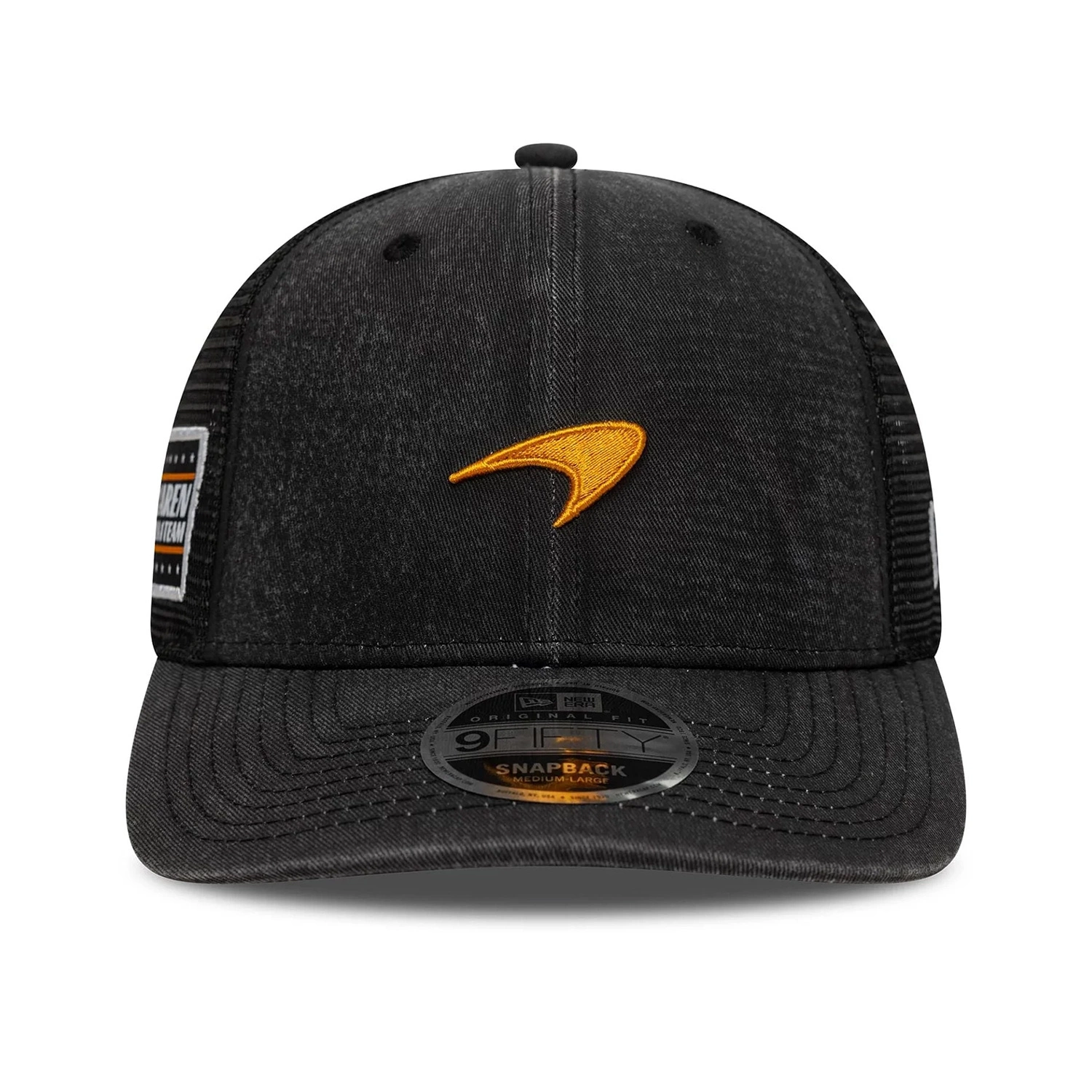 Official snapback cap of the McLaren F1 Team, designed by New Era in black with a washed effect. This cap features a curved brim, structured crown, and adjustable snapback closure, blending classic style with an urban vibe. A perfect choice for fans of Formula 1 and supporters of the McLaren team.