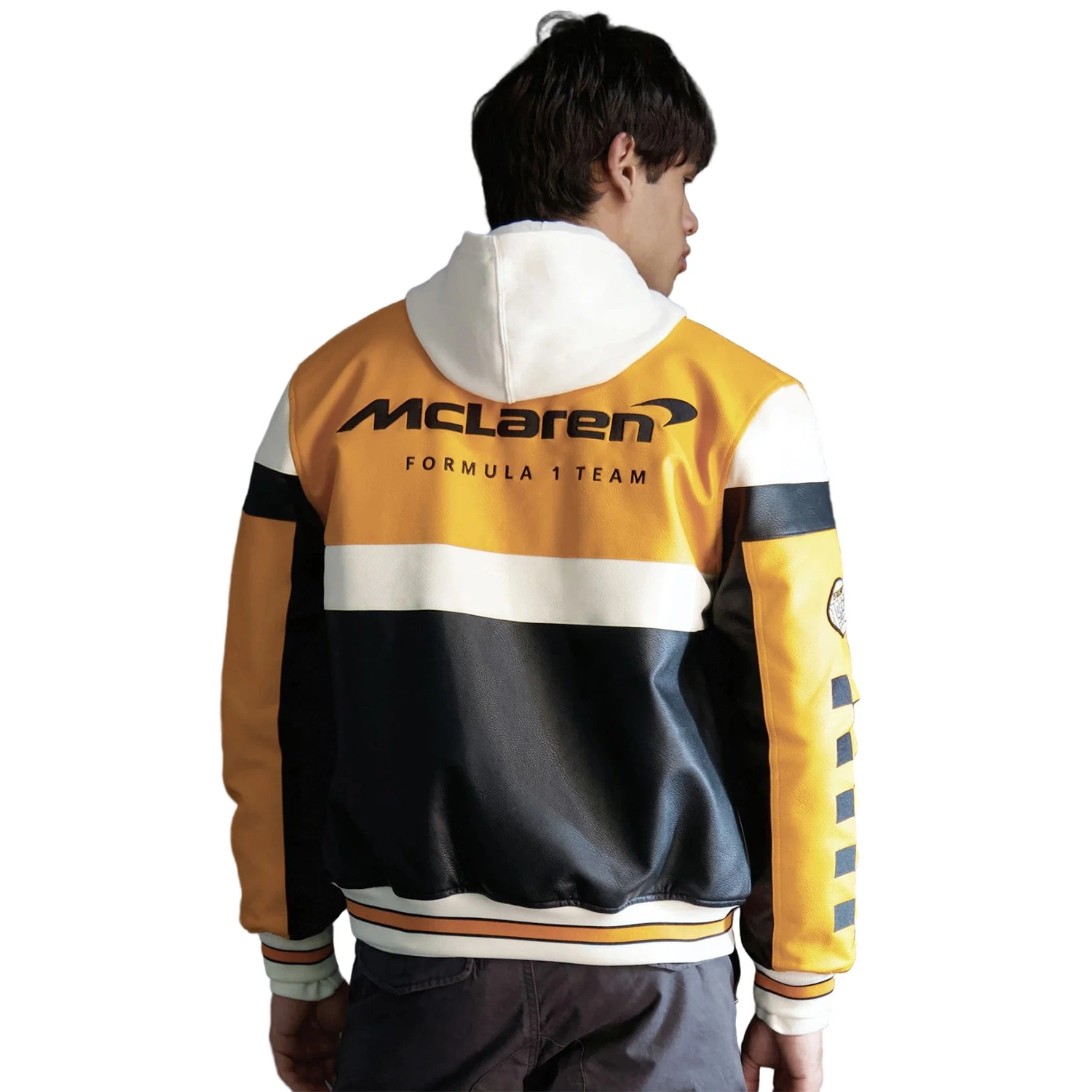 The official McLaren F1 Turbo Charged Jacket combines precision craftsmanship with the dynamic spirit of Formula 1. Made from premium vegan leather, it delivers lightness, durability, and a distinctive style inspired by the McLaren F1 Team legacy. Perfect for motorsport enthusiasts who value refined details and authentic racing character.