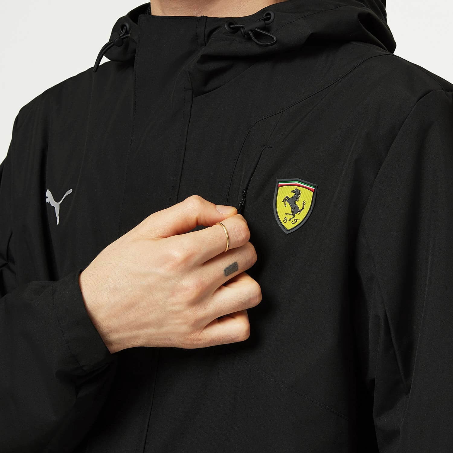 Wodoodporna i wszechstronna kurtka przeciwdeszczowa Scuderia Ferrari. Hydrofobowa powłoka wierzchniej tkaniny zwiększa ochronę przed deszczem. Kurtka łączy w sobie komfort i wydajność odzieży wierzchniej PUMA, a także eleganckie akcenty inspirowane stylistyką bolidu Scuderia Ferrari F1.