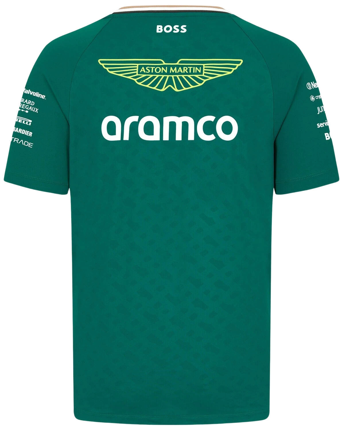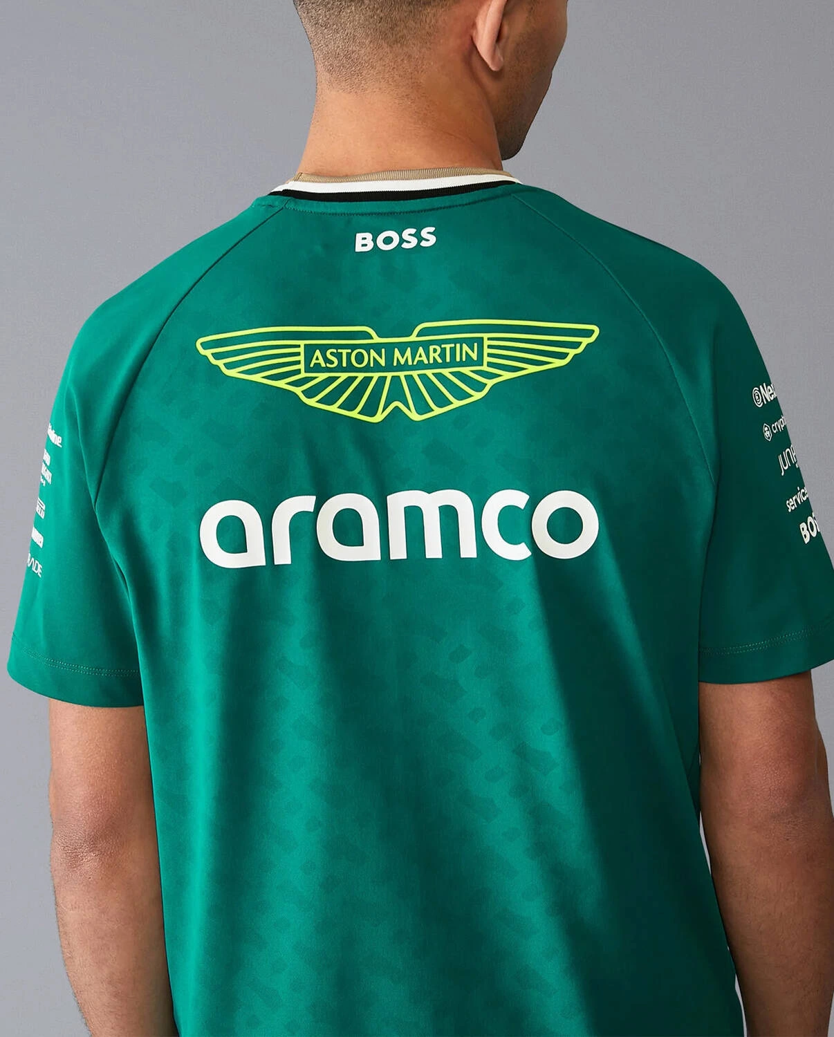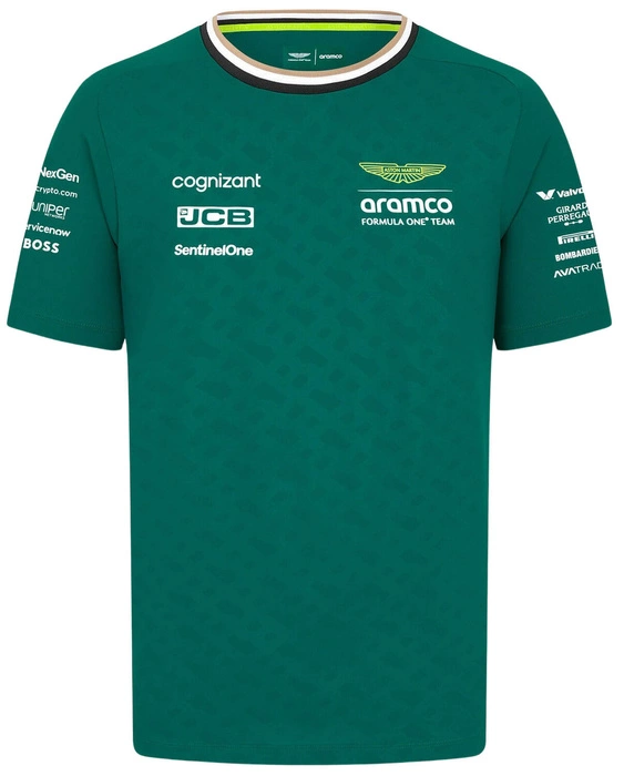 Oficjalny t-shirt Aston Martin F1 Team wykonany z wydajnego materiału odprowadzającego wilgoć, gwarantuje niezrównany komfort, pozwalając skórze oddychać i utrzymując uczucie świeżości przez cały dzień. Dodatkowo, ozdobiony tonalnym nadrukiem monogramu i detalami BOSS na kołnierzyku i bocznym szwie, posiada precyzyjnie nadrukowane logo zespołu Aston Martin Aramco Formula One Team i branding sponsorów, co sprawia, że jest idealnym wyborem dla każdego fana Formuły 1, pragnącego wyrazić swoje wsparcie dla tego legendarnego zespołu wyścigowego.