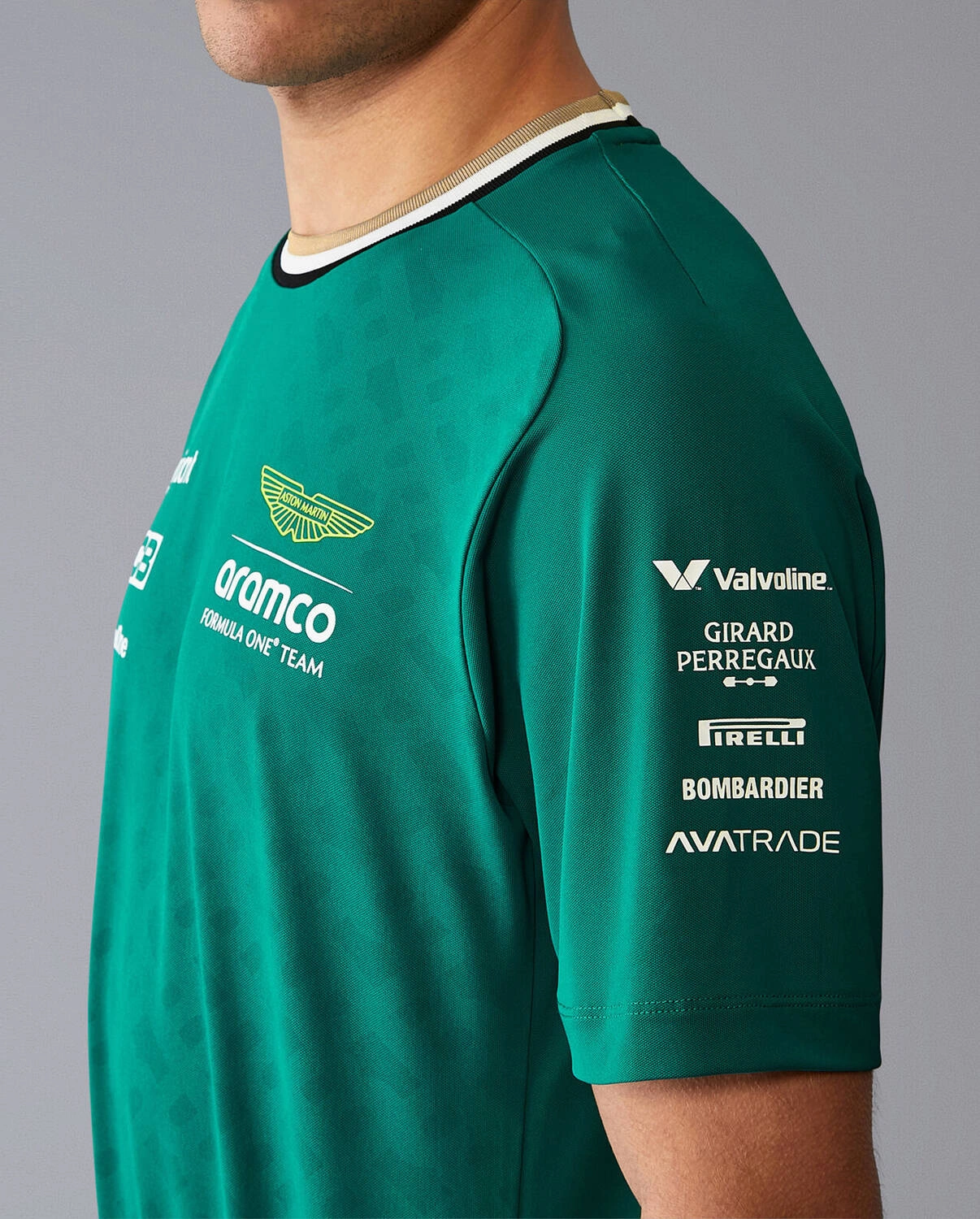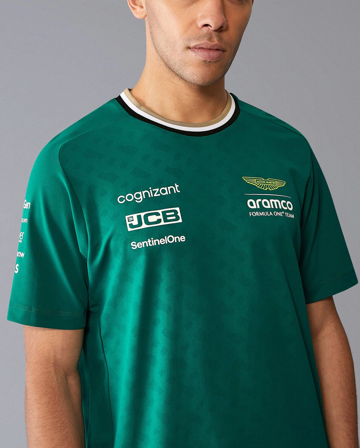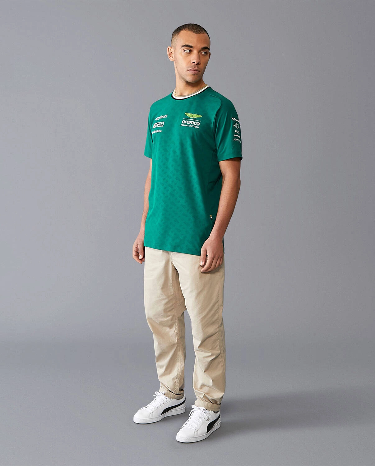 Oficjalny t-shirt Aston Martin F1 Team wykonany z wydajnego materiału odprowadzającego wilgoć, gwarantuje niezrównany komfort, pozwalając skórze oddychać i utrzymując uczucie świeżości przez cały dzień. Dodatkowo, ozdobiony tonalnym nadrukiem monogramu i detalami BOSS na kołnierzyku i bocznym szwie, posiada precyzyjnie nadrukowane logo zespołu Aston Martin Aramco Formula One Team i branding sponsorów, co sprawia, że jest idealnym wyborem dla każdego fana Formuły 1, pragnącego wyrazić swoje wsparcie dla tego legendarnego zespołu wyścigowego.