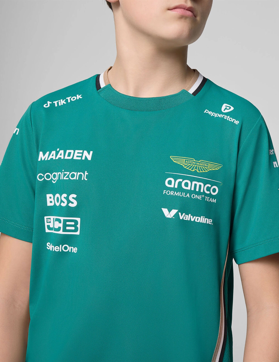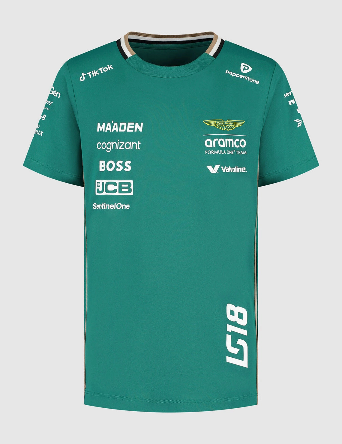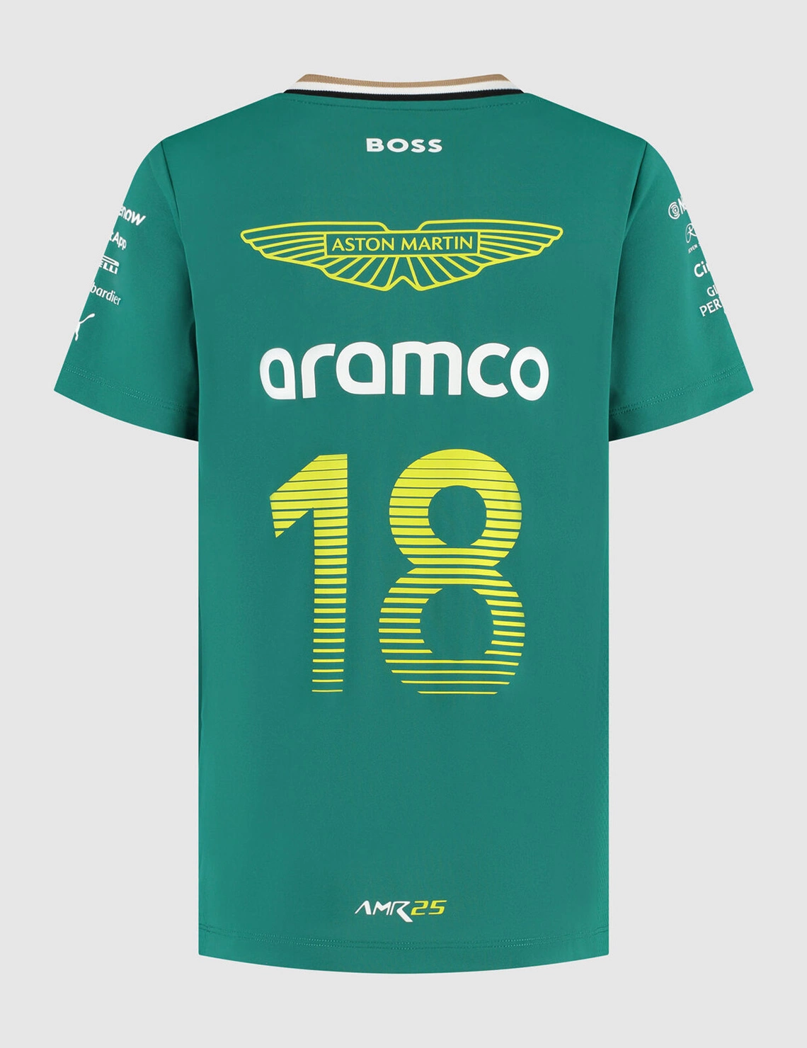 Dziecięca wersja oficjalnej koszulki Lance’a Strolla na sezon 2025 Formuły 1 to doskonały wybór dla każdego fana kanadyjskiego kierowcy. Wykonana z oddychającego materiału odprowadzającego wilgoć, zapewnia komfort przez cały dzień, niezależnie od warunków. Na plecach widnieje numer „18” Lance’a, a z przodu znajduje się jego logo, co sprawia, że t-shirt świetnie sprawdzi się zarówno na co dzień, jak i podczas wyścigów. Dodatkowo subtelne detale BOSS, takie jak markowe akcenty na kołnierzyku i bocznych panelach, nadają unikalnego charakteru.
