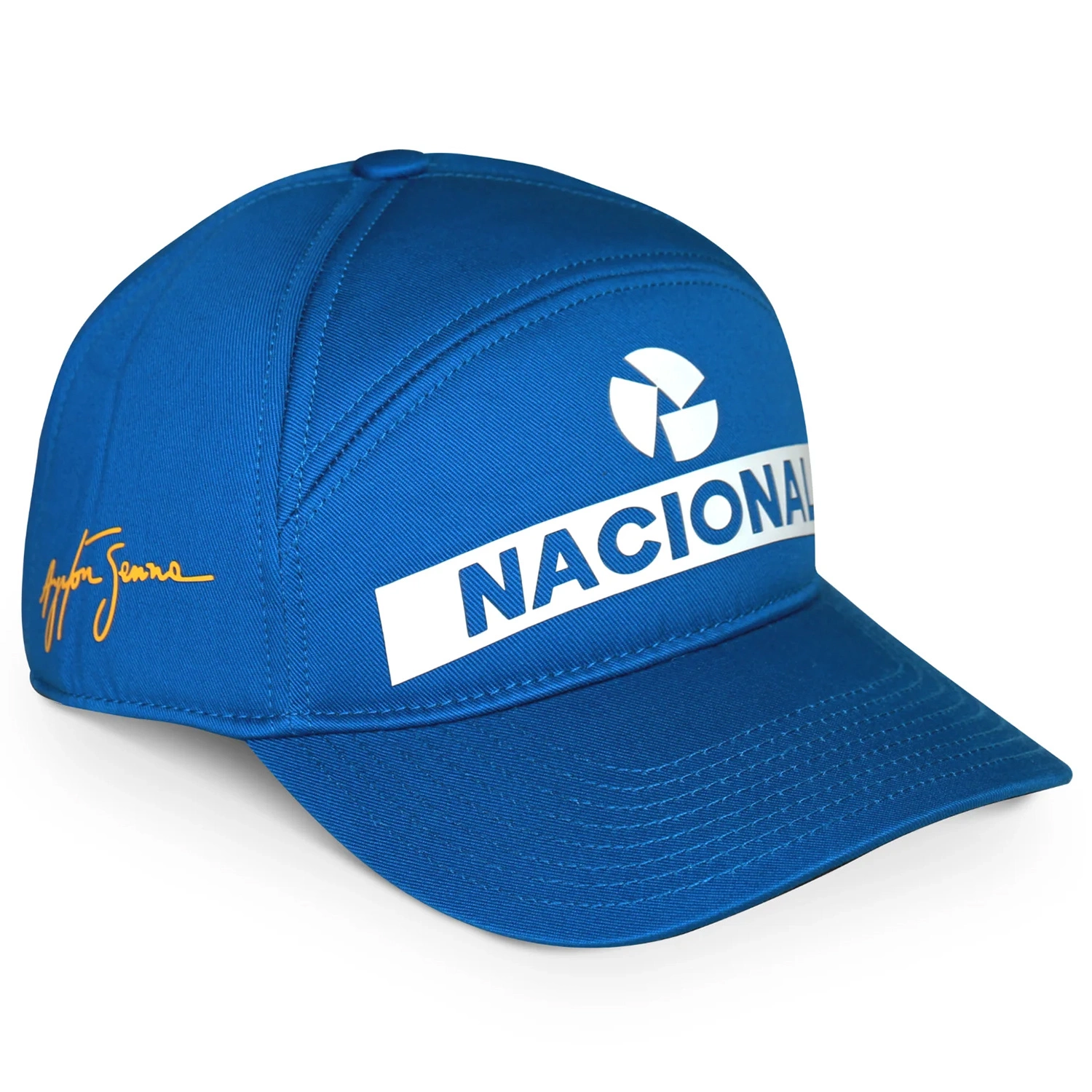 Replika oryginalnej czapki Ayrtona Senny. Kultowa niebieska czapka z wypukłym nadrukiem „Nacional” z przodu, nawiązującym do wieloletniego sponsora brazylijskiego mistrza. Na obu bokach widnieją natomiast nadruki z jego podpisem, co czyni ją prawdziwym hołdem dla legendarnego kierowcy.