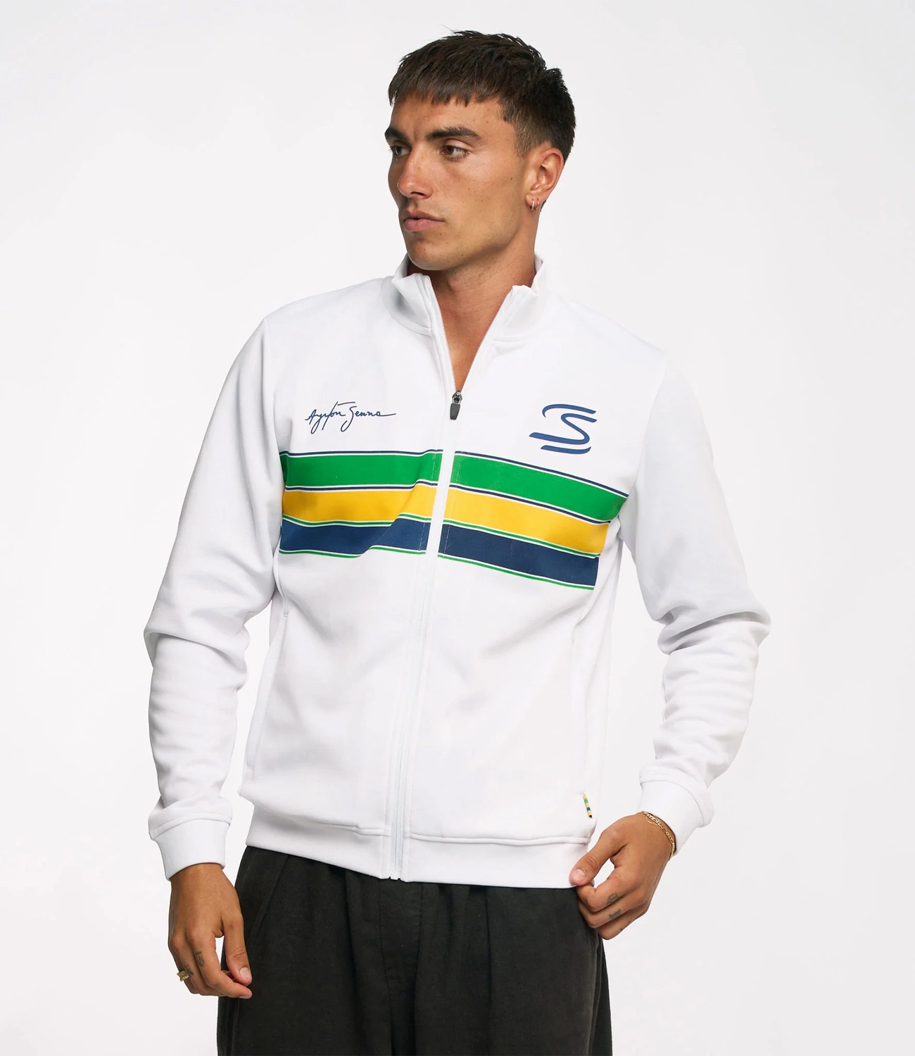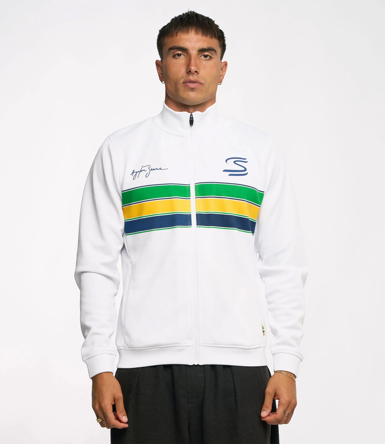 Rozpinana bluza Ayrton Senna Retro Stripe wykonana jest z wysokiej jakości, miękkiego materiału, który zapewnia komfort noszenia i trwałość. Jej design inspirowany barwami kasku legendarnego kierowcy nadaje bluzie wyjątkowego, ponadczasowego charakteru.